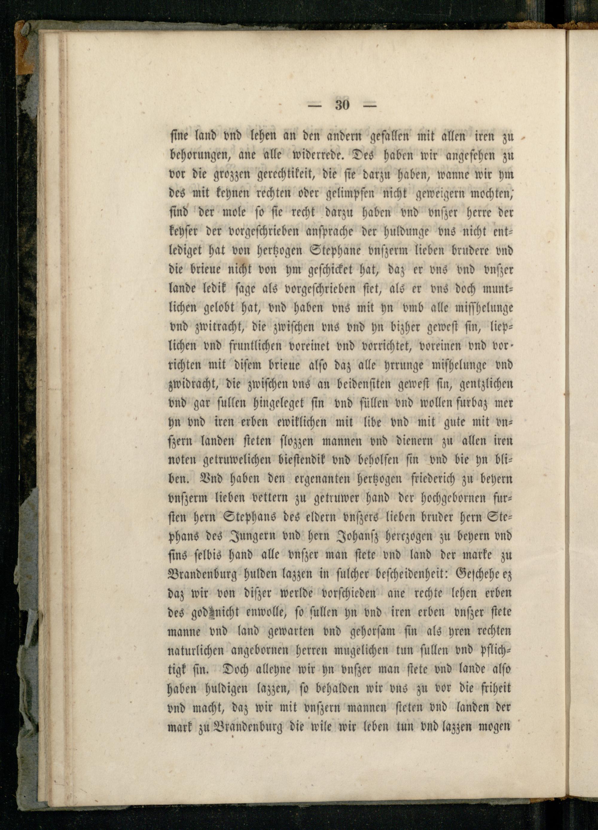ſine land vnd lehen an den andern gefallen mit allen iren zu behorungen, ane alle widerrede. Des haben wir angeſehen zu vor die grozzen gerechtikeit, die fie darzu haben, wanne wir hm des mit keynen rechten oder gelimpfen nicht geweigern mochten, find der mole fo ſie recht darzu haben vnd vnſzer herre der keyſer der vorgeſchrieben anſprache der huldunge vns nicht entlediget hat von hertzogen Stephane vnſzerm lieben brudere vnd die brieue nicht von hm geſchicket hat, daz er vns vnd vnßer lande ledik ſage als vorgeſchrieben ſtet, als er vns doch muntlichen gelobt hat, vnd haben vns mit yn vmb alle miſſhelunge vnd zwitracht, die zwiſchen vns vnd yn bizher geweſt fin, lieplichen vnd fruntlichen voreinet vnd vorrichtet, voreinen vnd vor richten mit diſem brieue alſo daz alle hrrunge miſhelunge vnd zwidracht, die zwiſchen vns an beidenſiten geweſt ſin, gentzlichen vnd gar ſullen hingeleget ſin vnd ſüllen vnd wollen furbaz mer hn vnd iren erben ewiklichen mit libe vnd mit gute mit vnſzern landen ſteten ſlozzen mannen vnd dienern zu allen iren noten getruwelichen bieſtendik vnd beholſen ſin vnd bie yn bliben. Vnd haben den ergenanten hertzogen friederich zu beyern vnſzerm lieben vettern zu getruwer hand der hochgebornen furſten hern Stephans des eldern vnßers lieben bruder hern Stephans des Jungern vnd hern Johanſz herczogen zu beyern vnd ſins ſelbis hand alle vnfßer man ſtete vnd land der marke zu Brandenburg hulden lazzen in ſulcher beſcheidenheit: Geſchehe ez daz wir von diſzer werlde vorſchieden ane rechte lehen erben des godänicht enwolle, ſo ſullen n vnd iren erben vnſzer ſtete manne vnd land gewarten vnd gehorſam ſin als yren rechten naturlichen angebornen herren mugelichen tun ſullen vnd pflichtigt ſin. Doch alleyne wir hn vnſzer man ſtete vnd lande alſo haben huldigen lazzen, fo behalden wir vns zu vor die friheit vnd macht, daz wir mit vnſzern mannen ſteten ond landen der mark zu Brandenburg die wile wir leben tun vnd lazzen mogen