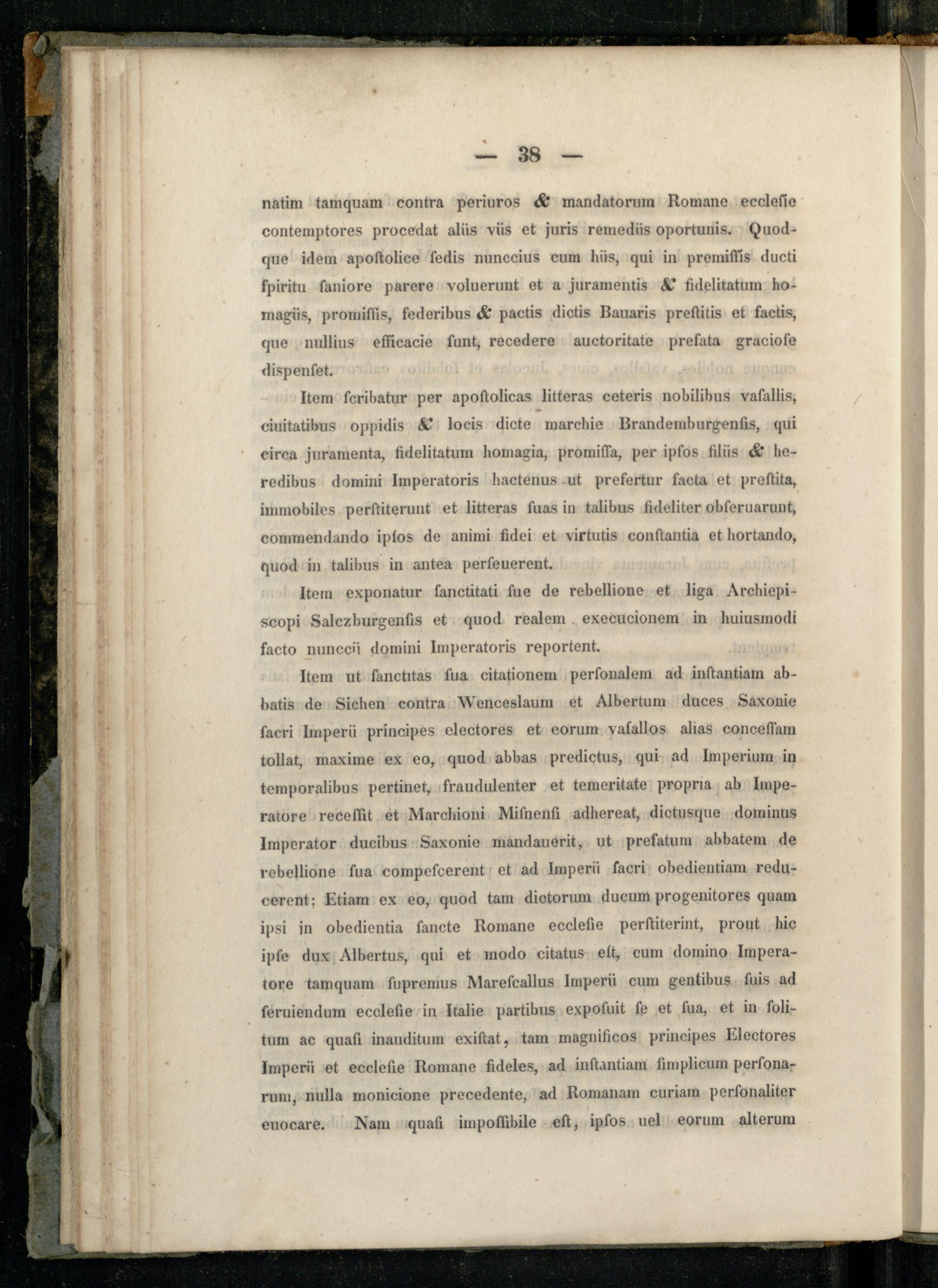 Item ut ſanctitas ſua citationem perſonalem ad inſtantiam abbatis de Sichen contra Wenceslaum et Albertum duces Saxonie facri Imperü principes electores et eorum vaſallos alias conceſſam tollat, maxime ex eo, quod abbas predietus, qui ad Imperium in temporalibus pertinet, fraudulenter et temeritate propria ab Imperatore reoeſſit ẽt Marchioni Mifnenfi adhereat, diotusque dominus Imperator ducibus Saxonie mandausrit, ut prefatum abbatem de rebellione ſua compeſcerent et ad Imperü ſacri obedientiam reducerent; Etiam ex eo, quod tam diotorum ducum progenitores quam ipsi in obedientia ſancte Romane ecclefie perſtiterint, prout hie ipfe dux Albertus, qui et modo citatus eſt, cum domino Imperatore tamquam ſupremus Mareſcallus Imperü cum gentihus ſuis ad ſeruiendum ecaleſie in Italie partibus expofuit fe et ſua, et in ſolitum ac quaſi inauditum exiſtat, tam magnificos principes Electores Imperi et ecclefie Romane ſideles, ad inſtantiam ſimplicum perſonarum, nulla monicione precedente, ad Romanam curiam perſonaliter