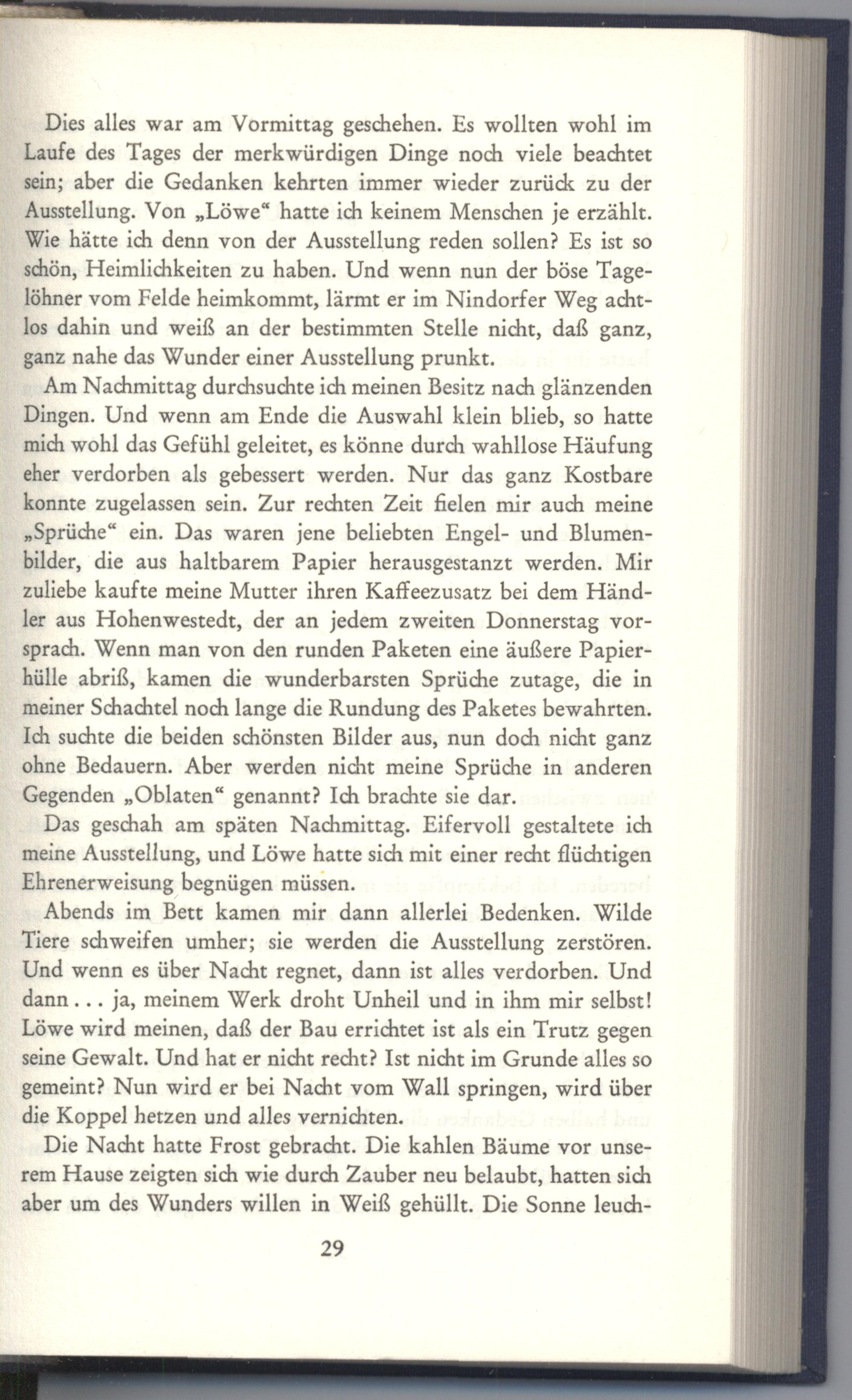 Dies alles war am Vormittag geschehen. Es wollten wohl im Laufe des Tages der merkwürdigen Dinge noch viele beachtet sein; aber die Gedanken kehrten immer wieder zurück zu der Ausstellung. Von„Löwe“ hatte ich keinem Menschen je erzählt. Wie hätte ich denn von der Ausstellung reden sollen? Es ist so schön, Heimlichkeiten zu haben. Und wenn nun der böse Tagelöhner vom Felde heimkommt, lärmt er im Nindorfer Weg achtlos dahin und weiß an der bestimmten Stelle nicht, daß ganz, ganz nahe das Wunder einer Ausstellung prunkt.