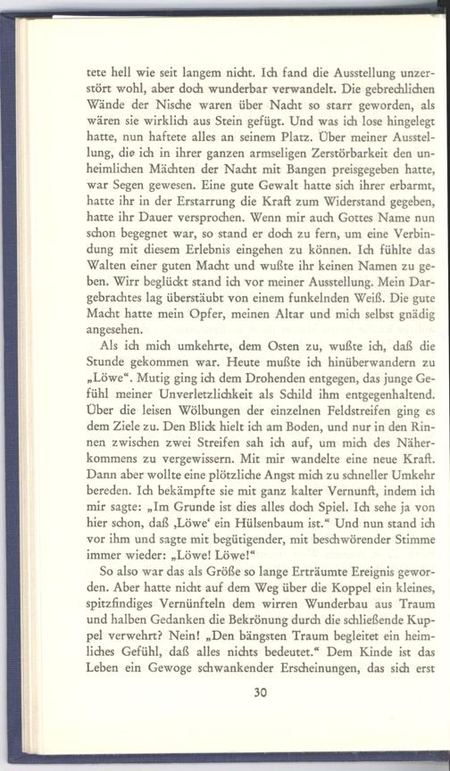 Als ich mich umkehrte, dem Osten zu, wußte ich, daß die Stunde gekommen war. Heute mußte ich hinüberwandern zu „Löwe“, Mutig ging ich dem Drohenden entgegen, das junge Gefühl meiner Unverletzlichkeit als Schild ihm entgegenhaltend. Über die leisen Wölbungen der einzelnen Feldstreifen ging es dem Ziele zu. Den Blick hielt ich am Boden, und nur in den Rinnen zwischen zwei Streifen sah ich auf, um mich des Näherkommens zu vergewissern. Mit mir wandelte eine neue Kraft. Dann aber wollte eine plötzliche Angst mich zu schneller Umkehr bereden. Ich bekämpfte sie mit ganz kalter Vernunft, indem ich mir sagte:„Im Grunde ist dies alles doch Spiel. Ich sehe ja von hier schon, daß ‚Löwe‘ ein Hülsenbaum ist.“ Und nun stand ich vor ihm und sagte mit begütigender, mit beschwörender Stimme immer wieder:„Löwe! Löwe!“