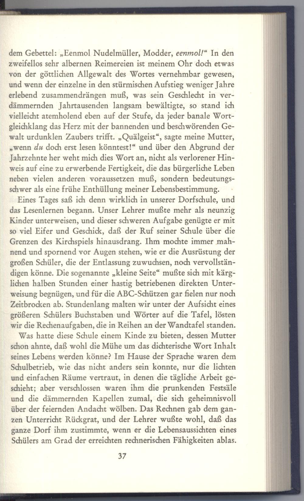 dem Gebettel:„Eenmol Nudelmüller, Modder, eenmol!“ In den zweifellos sehr albernen Reimereien ist meinem Ohr doch etwas von der göttlichen Allgewalt des Wortes vernehmbar gewesen, und wenn der einzelne in den stürmischen Aufstieg weniger Jahre erlebend zusammendrängen muß, was sein Geschlecht in verdämmernden Jahrtausenden langsam bewältigte, so stand ich vielleicht atemholend eben auf der Stufe, da jeder banale Wortgleichklang das Herz mit der bannenden und beschwörenden Gewalt urdunklen Zaubers trifft.„Quälgeist“, sagte meine Mutter, „wenn dw doch erst lesen könntest!“ und über den Abgrund der Jahrzehnte her weht mich dies Wort an, nicht als verlorener Hinweis auf eine zu erwerbende Fertigkeit, die das bürgerliche Leben neben vielen anderen voraussetzen muß, sondern bedeutungsschwer als eine frühe Enthüllung meiner Lebensbestimmung. Eines Tages saß ich denn wirklich in unserer Dorfschule, und das Lesenlernen begann. Unser Lehrer mußte mehr als neunzig Kinder unterweisen, und dieser schweren Aufgabe genügte er mit so viel Eifer und Geschick, daß der Ruf seiner Schule über die Grenzen des Kirchspiels hinausdrang. Ihm mochte immer mahnend und spornend vor Augen stehen, wie er die Ausrüstung der großen Schüler, die der Entlassung zuwuchsen, noch vervollständigen könne. Die sogenannte„kleine Seite“ mußte sich mit kärglichen halben Stunden einer hastig betriebenen direkten Unterweisung begnügen, und für die ABC-Schützen gar fielen nur noch Zeitbrocken ab. Stundenlang malten wir unter der Aufsicht eines größeren Schülers Buchstaben und Wörter auf die Tafel, lösten wir die Rechenaufgaben, die in Reihen an der Wandtafel standen. Was hatte diese Schule einem Kinde zu bieten, dessen Mutter schon ahnte, daß wohl die Mühe um das dichterische Wort Inhalt seines Lebens werden könne? Im Hause der Sprache waren dem Schulbetrieb, wie das nicht anders sein konnte, nur die lichten und einfachen Räume vertraut, in denen die tägliche Arbeit geschieht; aber verschlossen waren ihm die prunkenden Festsäle und die dämmernden Kapellen zumal, die sich geheimnisvoll über der feiernden Andacht wölben. Das Rechnen gab dem ganzen Unterricht Rückgrat, und der Lehrer wußte wohl, daß das ganze Dorf ihm zustimmte, wenn er die Lebensaussichten eines Schülers am Grad der erreichten rechnerischen Fähigkeiten ablas.