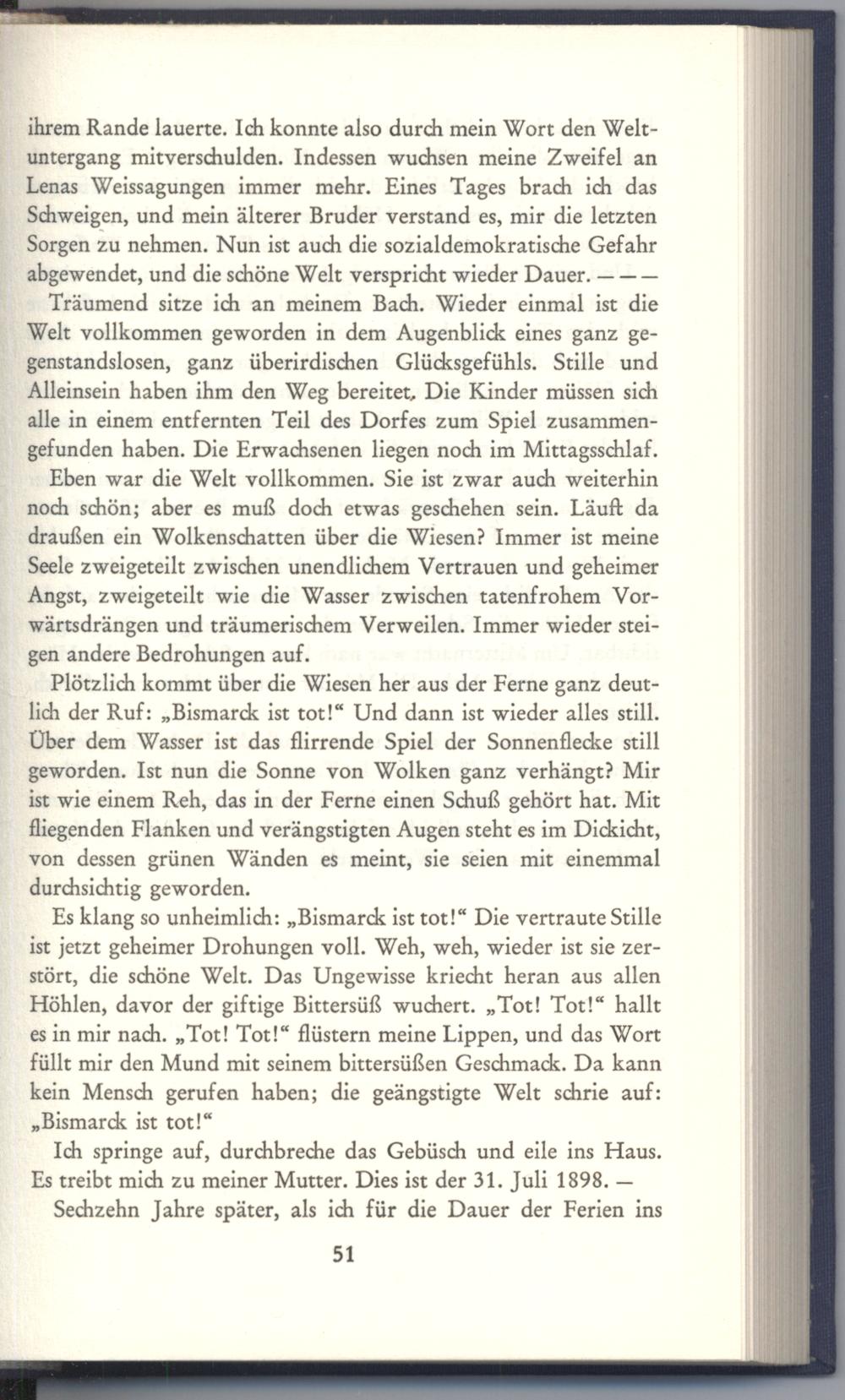 Plötzlich kommt über die Wiesen her aus der Ferne ganz deutlich der Ruf:„Bismarck ist tot!“ Und dann ist wieder alles still. Über dem Wasser ist das flirrende Spiel der Sonnenflecke still geworden. Ist nun die Sonne von Wolken ganz verhängt? Mir ist wie einem Reh, das in der Ferne einen Schuß gehört hat. Mit fliegenden Flanken und verängstigten Augen steht es im Dickicht, von dessen grünen Wänden es meint, sie seien mit einemmal durchsichtig geworden.