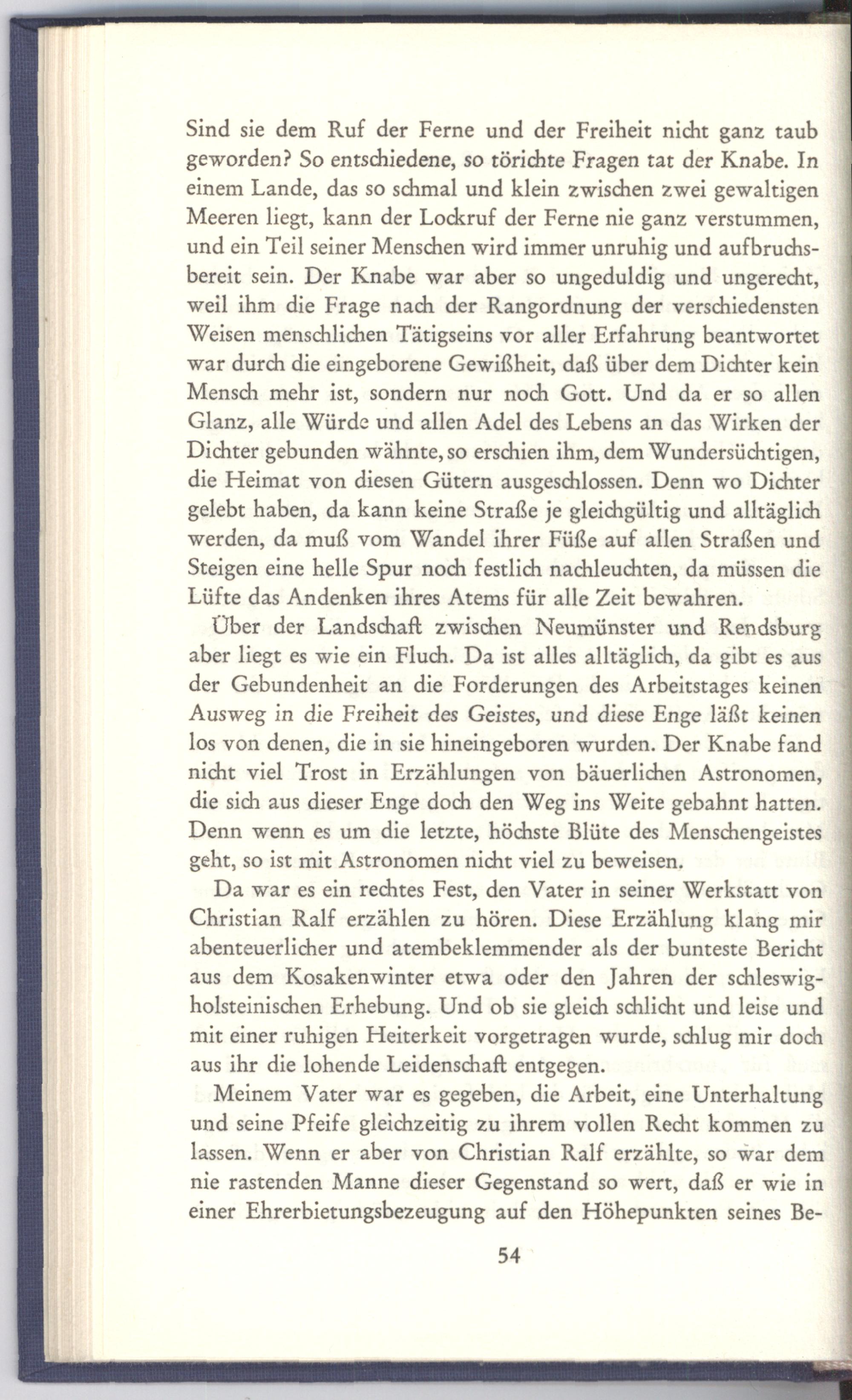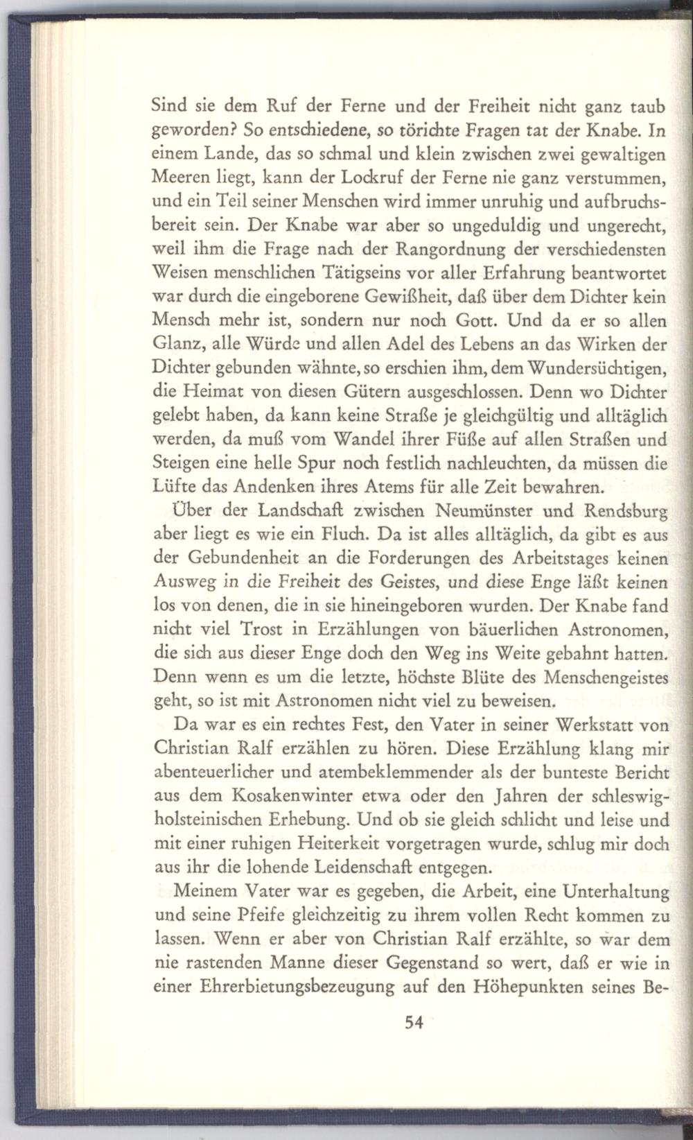 Da war es ein rechtes Fest, den Vater in seiner Werkstatt von Christian Ralf erzählen zu hören. Diese Erzählung klang mir abenteuerlicher und atembeklemmender als der bunteste Bericht aus dem Kosakenwinter etwa oder den Jahren der schleswigholsteinischen Erhebung. Und ob sie gleich schlicht und leise und mit einer ruhigen Heiterkeit vorgetragen wurde, schlug mir doch aus ihr die lohende Leidenschaft entgegen.|