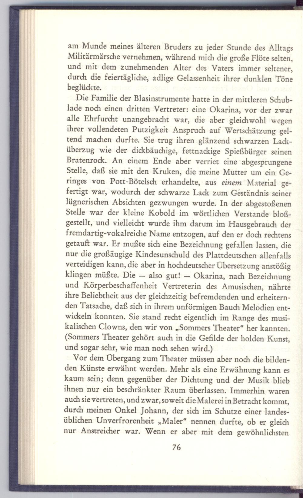 Die Familie der Blasinstrumente hatte in der mittleren Schublade noch einen dritten Vertreter: eine Okarina, vor der zwar alle Ehrfurcht unangebracht war, die aber gleichwohl wegen ihrer vollendeten Putzigkeit Anspruch auf Wertschätzung geltend machen durfte. Sie trug ihren glänzend schwarzen Lacküberzug wie der dickbäuchige, fettnackige Spießbürger seinen Bratenrock. An einem Ende aber verriet eine abgesprungene Stelle, daß sie mit den Kruken, die meine Mutter um ein Geringes von Pott-Bötelsch erhandelte, aus einem Material gefertigt war, wodurch der schwarze Lack zum Geständnis seiner lügnerischen Absichten gezwungen wurde. In der abgestoßenen Stelle war der kleine Kobold im wörtlichen Verstande bloßgestellt, und vielleicht wurde ihm darum im Hausgebrauch der fremdartig-vokalreiche Name entzogen, auf den er doch rechtens getauft war. Er mußte sich eine Bezeichnung gefallen lassen, die nur die großäugige Kindesunschuld des Plattdeutschen allenfalls verteidigen kann, die aber in hochdeutscher Übersetzung anstößig klingen müßte. Die— also gut!— Okarina, nach Bezeichnung und Körperbeschaffenheit Vertreterin des Amusischen, nährte ihre Beliebtheit aus der gleichzeitig befremdenden und erheiternden Tatsache, daß sich in ihrem unförmigen Bauch Melodien entwickeln konnten, Sie stand recht eigentlich im Range des musikalischen Clowns, den wir von„Sommers Theater“ her kannten. (Sommers Theater gehört auch in die Gefilde der holden Kunst, und sogar sehr, wie man noch sehen wird.)