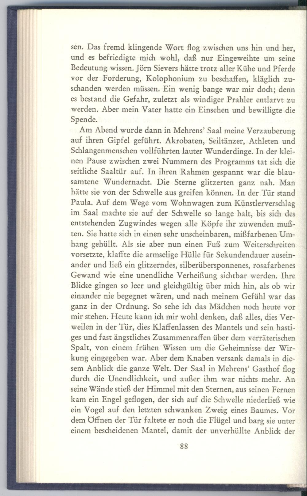 Am Abend wurde dann in Mehrens’ Saal meine Verzauberung auf ihren Gipfel geführt. Akrobaten, Seiltänzer, Athleten und Schlangenmenschen vollführten lauter Wunderdinge. In der kleinen Pause zwischen zwei Nummern des Programms tat sich die seitliche Saaltür auf. In ihren Rahmen gespannt war die blausamtene Wundernacht. Die Sterne glitzerten ganz nah. Man hätte sie von der Schwelle aus greifen können. In der Tür stand Paula. Auf dem Wege vom Wohnwagen zum Künstlerverschlag im Saal machte sie auf der Schwelle so lange halt, bis sich des entstehenden Zugwindes wegen alle Köpfe ihr zuwenden mußten. Sie hatte sich in einen sehr unscheinbaren, mißfarbenen Umhang gehüllt. Als sie aber nun einen Fuß zum Weiterschreiten vorsetzte, klaffte die armselige Hülle für Sekundendauer auseinander und ließ ein glitzerndes, silberübersponnenes, rosafarbenes Gewand wie eine unendliche Verheißung sichtbar werden. Ihre Blicke gingen so leer und gleichgültig über mich hin, als ob wir einander nie begegnet wären, und nach meinem Gefühl war das ganz in der Ordnung. So sehe ich das Mädchen noch heute vor mir stehen. Heute kann ich mir wohl denken, daß alles, dies Verweilen in der Tür, dies Klaffenlassen des Mantels und sein hastiges und fast ängstliches Zusammenraffen über dem verräterischen Spalt, von einem frühen Wissen um die Geheimnisse der Wirkung eingegeben war. Aber dem Knaben versank damals in diesem Anblick die ganze Welt. Der Saal in Mehrens’ Gasthof flog durch die Unendlichkeit, und außer ihm war nichts mehr. An seine Wände stieß der Himmel mit den Sternen, aus seinen Fernen kam ein Engel geflogen, der sich auf die Schwelle niederließ wie ein Vogel auf den letzten schwanken Zweig eines Baumes. Vor dem Öffnen der Tür faltete er noch die Flügel und barg sie unter einem bescheidenen Mantel, damit der unverhüllte Anblick der