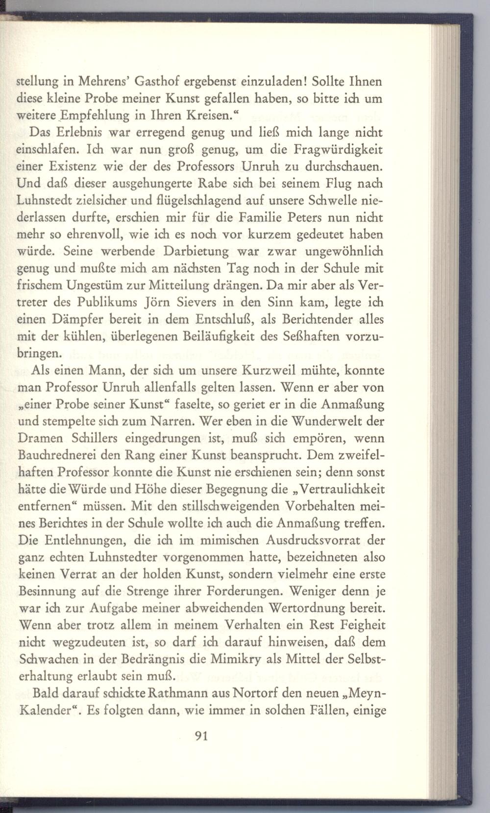Als einen Mann, der sich um unsere Kurzweil mühte, konnte man Professor Unruh allenfalls gelten lassen. Wenn er aber von „einer Probe seiner Kunst“ faselte, so geriet er in die Anmaßung und stempelte sich zum Narren. Wer eben in die Wunderwelt der Dramen Schillers eingedrungen ist, muß sich empören, wenn Bauchrednerei den Rang einer Kunst beansprucht. Dem zweifelhaften Professor konnte die Kunst nie erschienen sein; denn sonst hätte die Würde und Höhe dieser Begegnung die„Vertraulichkeit entfernen“ müssen. Mit den stillschweigenden Vorbehalten meines Berichtes in der Schule wollte ich auch die Anmaßung treffen. Die Entlehnungen, die ich im mimischen Ausdrucksvorrat der ganz echten Luhnstedter vorgenommen hatte, bezeichneten also keinen Verrat an der holden Kunst, sondern vielmehr eine erste Besinnung auf die Strenge ihrer Forderungen. Weniger denn je war ich zur Aufgabe meiner abweichenden Wertordnung bereit. Wenn aber trotz allem in meinem Verhalten ein Rest Feigheit nicht wegzudeuten ist, so darf ich darauf hinweisen, daß dem Schwachen in der Bedrängnis die Mimikry als Mittel der Selbsterhaltung erlaubt sein muß.