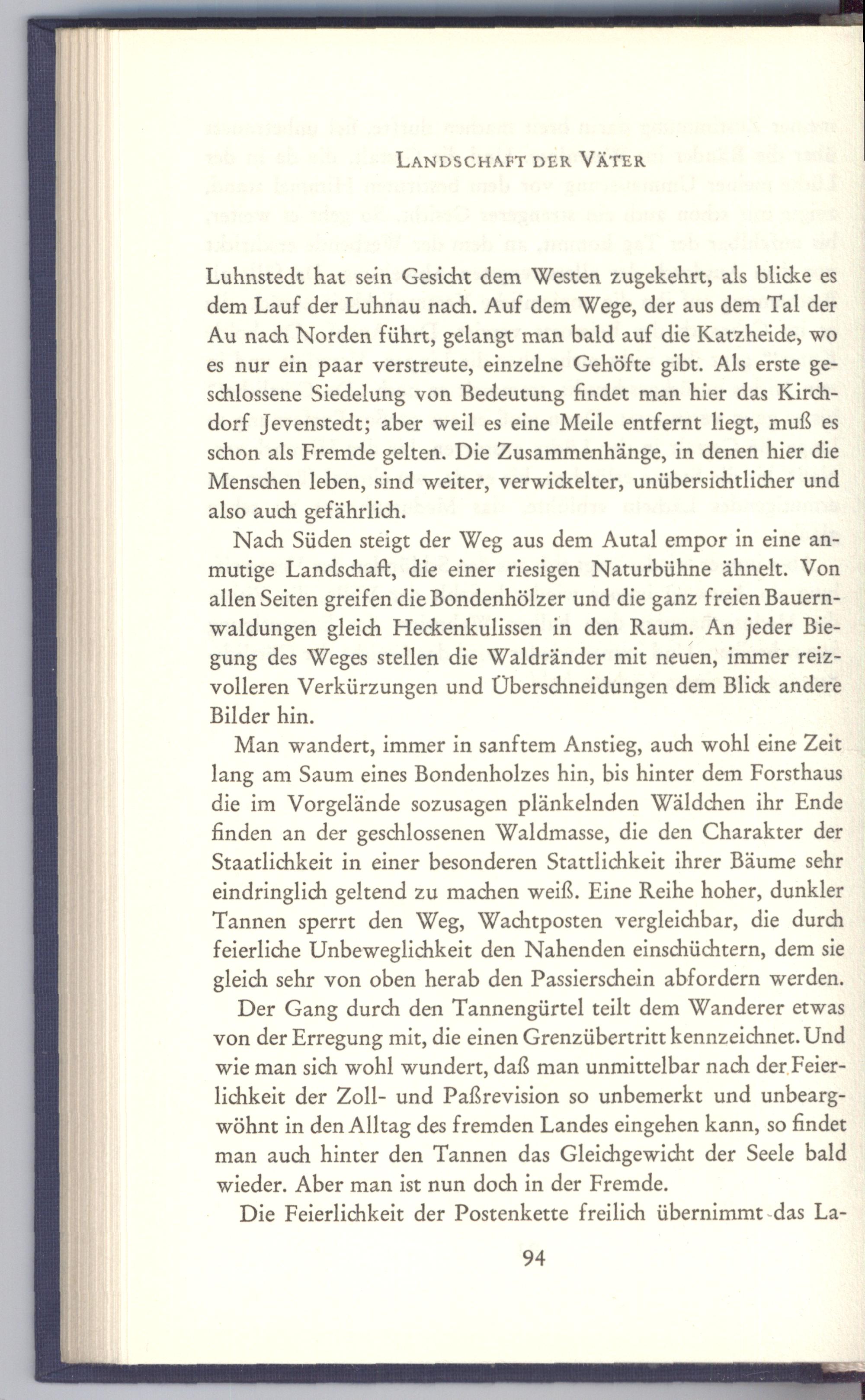 Der Gang durch den Tannengürtel teilt dem Wanderer etwas von der Erregung mit, die einen Grenzübertritt kennzeichnet. Und wie man sich wohl wundert, daß man unmittelbar nach der Feierlichkeit der Zoll- und Paßrevision so unbemerkt und unbeargwöhnt in den Alltag des fremden Landes eingehen kann, so findet man auch hinter den Tannen das Gleichgewicht der Seele bald wieder. Aber man ist nun doch in der Fremde.
