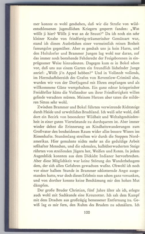 Zwischen Brammer und Bokel führten verwirrende Richtsteige durch Heide und urweltliches Bruchland. Ich weiß sehr wohl, daß dort ein Bezirk von besonderer Wildheit und Weltabgeschiedenheit in einer guten Viertelstunde zu durchqueren ist. Aber immer wieder dehnt die Erinnerung an Kindheitswanderungen zum Großvater den bescheidenen Raum wider alles bessere Wissen ins Riesenhafte. Stundenlang streiften wir durch die Steppen Nordamerikas. Hier gemahnte nichts mehr an die geduldige Arbeit seßhafter Menschen, und die schmalen, halbüberwucherten Steige rührten von streifenden Jägern her, Weißen und Roten. In jedem Augenblick konnten aus dem Dickicht Indianer hervorbrechen. Aber diese Möglichkeit war keine Störung des Wanderbehagens dem, der sich allen Gefahren gewachsen wußte. Obwohl ich noch vor einer halben Stunde in Brammer schlotternde Angst ausgestanden hatte, war doch dieses Erlebnis nun schon ganz versunken, und von dorther konnte keine Beschimung mir den hohen Mut dämpfen.