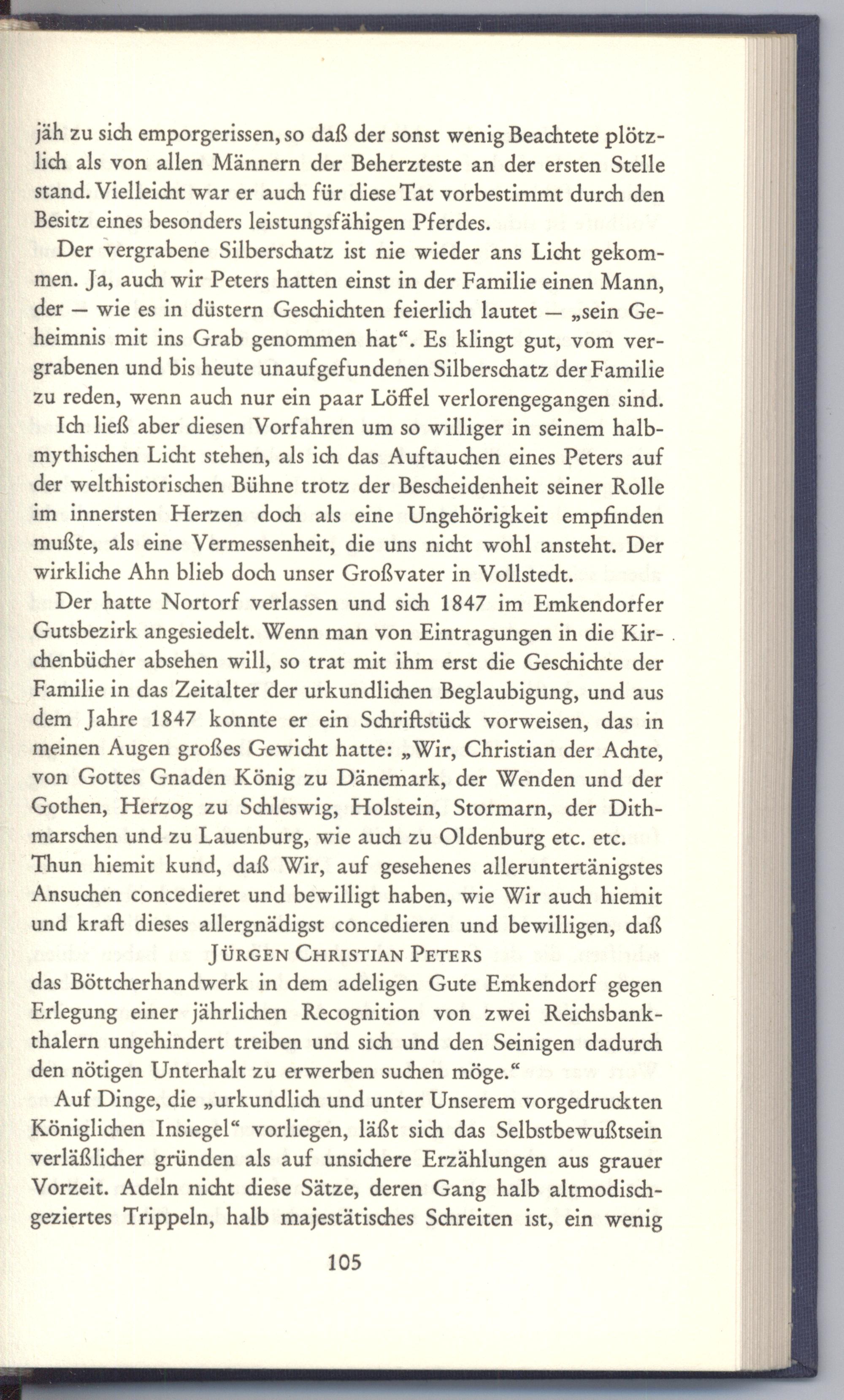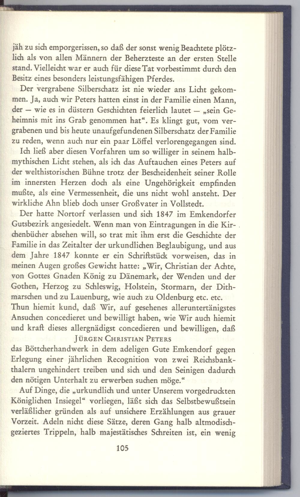 Der hatte Nortorf verlassen und sich 1847 im Emkendorfer Gutsbezirk angesiedelt. Wenn man von Eintragungen in die Kir-. chenbücher absehen will, so trat mit ihm erst die Geschichte der Familie in das Zeitalter der urkundlichen Beglaubigung, und aus dem Jahre 1847 konnte er ein Schriftstück vorweisen, das in meinen Augen großes Gewicht hatte:„Wir, Christian der Achte, von Gottes Gnaden König zu Dänemark, der Wenden und der Gothen, Herzog zu Schleswig, Holstein, Stormarn, der Dithmarschen und zu Lauenburg, wie auch zu Oldenburg etc. etc. Thun hiemit kund, daß Wir, auf gesehenes alleruntertänigstes Ansuchen concedieret und bewilligt haben, wie Wir auch hiemit und kraft dieses allergnädigst concedieren und bewilligen, daß