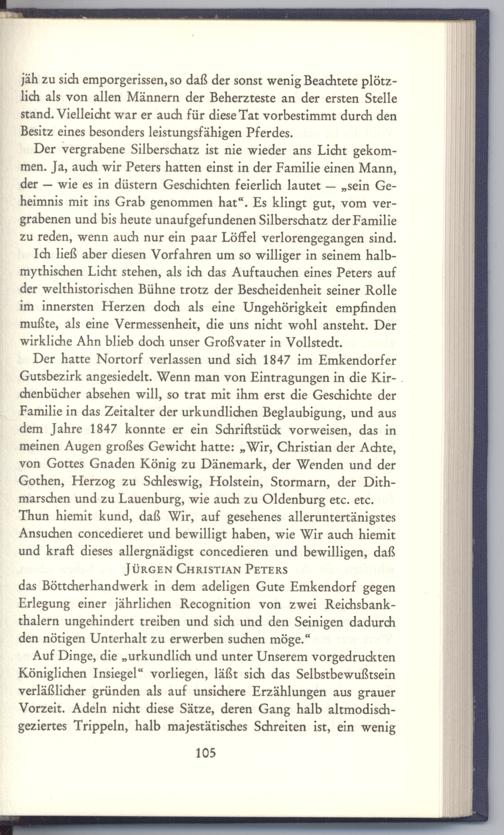 Ich ließ aber diesen Vorfahren um so williger in seinem halbmythischen Licht stehen, als ich das Auftauchen eines Peters auf der welthistorischen Bühne trotz der Bescheidenheit seiner Rolle im innersten Herzen doch als eine Ungehörigkeit empfinden mußte, als eine Vermessenheit, die uns nicht wohl ansteht. Der wirkliche Ahn blieb doch unser Großvater in Vollstedt.