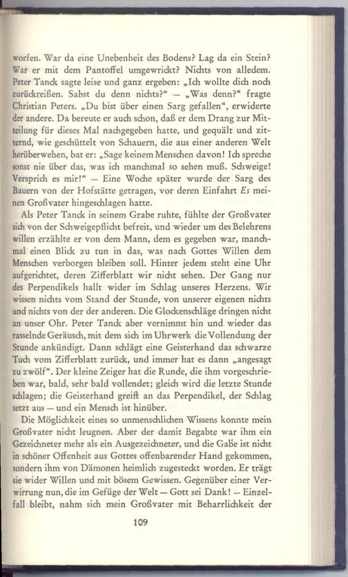 ‘worfen. War da eine Unebenheit des Bodens? Lag da ein Stein? War er mit dem Pantoffel umgewrickt? Nichts von alledem. Peter Tanck sagte leise und ganz ergeben:„Ich wollte dich noch zurückreißen. Sahst du denn nichts?“—„Was denn?“ fragte hristian Peters.„Du bist über einen Sarg gefallen“, erwiderte er andere. Da bereute er auch schon, daß er dem Drang zur Mitilung für dieses Mal nachgegeben hatte, und gequält und zitternd, wie geschüttelt von Schauern, die aus einer anderen Welt herüberwehen, bat er:„Sage keinem Menschen davon! Ich spreche nst nie über das, was ich manchmal so sehen muß. Schweige! ersprich es mir!“— Eine Woche später wurde der Sarg des auern von der Hofstätte getragen, vor deren Einfahrt Es meien Großvater hingeschlagen hatte. Als Peter Tanck in seinem Grabe ruhte, fühlte der Großvater ch von der Schweigepflicht befreit, und wieder um des Belehrens illen erzählte er von dem Mann, dem es gegeben war, manchal einen Blick zu tun in das, was nach Gottes Willen dem enschen verborgen bleiben soll. Hinter jedem steht eine Uhr ufgerichtet, deren Zifferblatt wir nicht sehen. Der Gang nur es Perpendikels hallt wider im Schlag unseres Herzens. Wir issen nichts vom Stand der Stunde, von unserer eigenen nichts nd nichts von der der anderen. Die Glockenschläge dringen nicht an unser Ohr. Peter Tanck aber vernimmt hin und wieder das asselnde Geräusch, mit dem sich im Uhrwerk die Vollendung der tunde ankündigt. Dann schlägt eine Geisterhand das schwarze Tuch vom Zifferblatt zurück, und immer hat es dann„angesagt u zwölf“. Der kleine Zeiger hat die Runde, die ihm vorgeschrien war, bald, sehr bald vollendet; gleich wird die letzte Stunde chlagen; die Geisterhand greift an das Perpendikel, der Schlag etzt aus— und ein Mensch ist hinüber. Die Möglichkeit eines so unmenschlichen Wissens konnte mein Großvater nicht leugnen. Aber der damit Begabte war ihm ein Gezeichneter mehr als ein Ausgezeichneter, und die Gabe ist nicht n schöner Offenheit aus Gottes offenbarender Hand gekommen, sondern ihm von Dämonen heimlich zugesteckt worden. Er trägt sie wider Willen und mit bösem Gewissen. Gegenüber einer Ver_ wirrung nun, die im Gefüge der Welt— Gott sei Dank!— Einzelfall bleibt, nahm sich mein Großvater mit Beharrlichkeit der