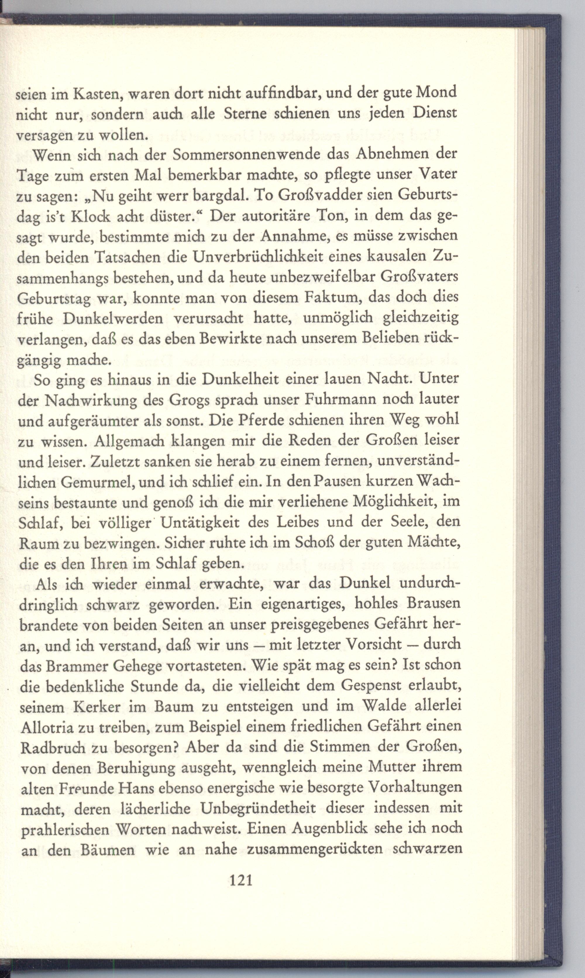 Wenn sich nach der Sommersonnenwende das Abnehmen der Tage zum ersten Mal bemerkbar machte, so pflegte unser Vater zu sagen:„Nu geiht werr bargdal. To Großvadder sien Geburtsdag is’t Klock acht düster.“ Der autoritäre Ton, in dem das gesagt wurde, bestimmte mich zu der Annahme, es müsse zwischen den beiden Tatsachen die Unverbrüchlichkeit eines kausalen Zusammenhangs bestehen, und da heute unbezweifelbar Großvaters Geburtstag war, konnte man von diesem Faktum, das doch dies frühe Dunkelwerden verursacht hatte, unmöglich gleichzeitig verlangen, daß es das eben Bewirkte nach unserem Belieben rückgängig mache.
