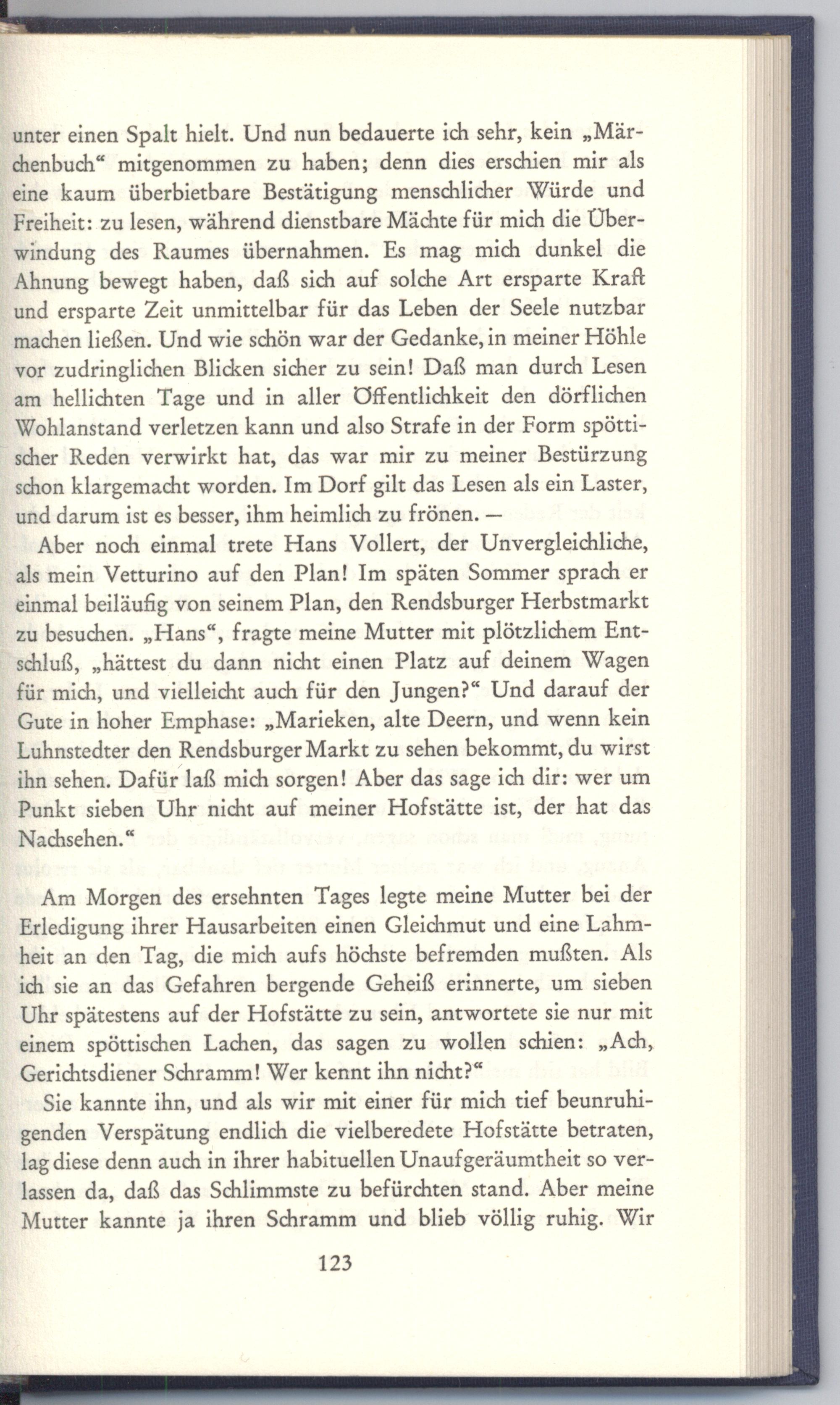 Am Morgen des ersehnten Tages legte meine Mutter bei der Erledigung ihrer Hausarbeiten einen Gleichmut und eine Lahmheit an den Tag, die mich aufs höchste befremden mußten. Als ich sie an das Gefahren bergende Geheiß erinnerte, um sieben Uhr spätestens auf der Hofstätte zu sein, antwortete sie nur mit einem spöttischen Lachen, das sagen zu wollen schien:„Ach, Gerichtsdiener Schramm! Wer kennt ihn nicht?“