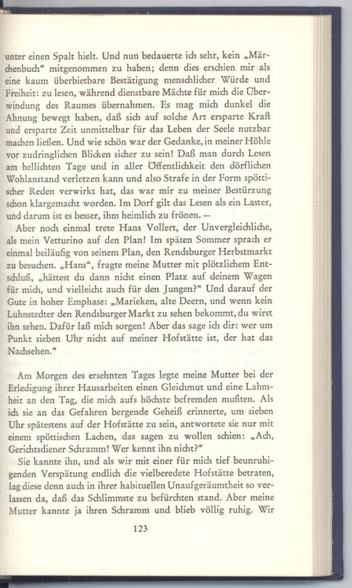 Aber noch einmal trete Hans Vollert, der Unvergleichliche, als mein Vetturino auf den Plan! Im späten Sommer sprach er einmal beiläufig von seinem Plan, den Rendsburger Herbstmarkt zu besuchen.„Hans“, fragte meine Mutter mit plötzlichem Entschluß,„hättest du dann nicht einen Platz auf deinem Wagen für mich, und vielleicht auch für den Jungen?“ Und darauf der Gute in hoher Emphase:„Marieken, alte Deern, und wenn kein Luhnstedter den Rendsburger Markt zu sehen bekommt, du wirst ihn sehen. Dafür laß mich sorgen! Aber das sage ich dir: wer um Punkt sieben Uhr nicht auf meiner Hofstätte ist, der hat das Nachsehen.“