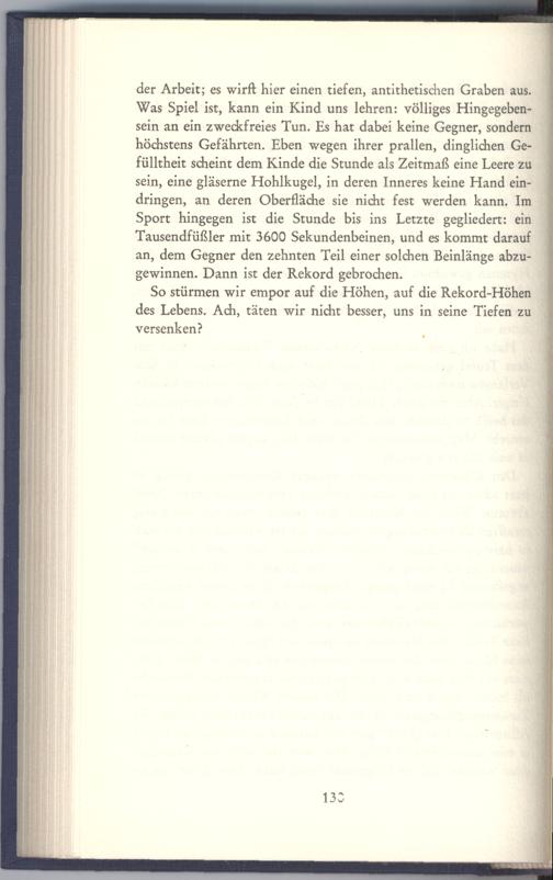 der Arbeit; es wirft hier einen tiefen, antithetischen Graben aus. Was Spiel ist, kann ein Kind uns lehren: völliges Hingegebensein an ein zweckfreies Tun. Es hat dabei keine Gegner, sondern höchstens Gefährten. Eben wegen ihrer prallen, dinglichen Gefülltheit scheint dem Kinde die Stunde als Zeitmaß eine Leere zu sein, eine gläserne Hohlkugel, in deren Inneres keine Hand eindringen, an deren Oberfläche sie nicht fest werden kann. Im Sport hingegen ist die Stunde bis ins Letzte gegliedert: ein Tausendfüßler mit 3600 Sekundenbeinen, und es kommt darauf an, dem Gegner den zehnten Teil einer solchen Beinlänge abzugewinnen. Dann ist der Rekord gebrochen.;
