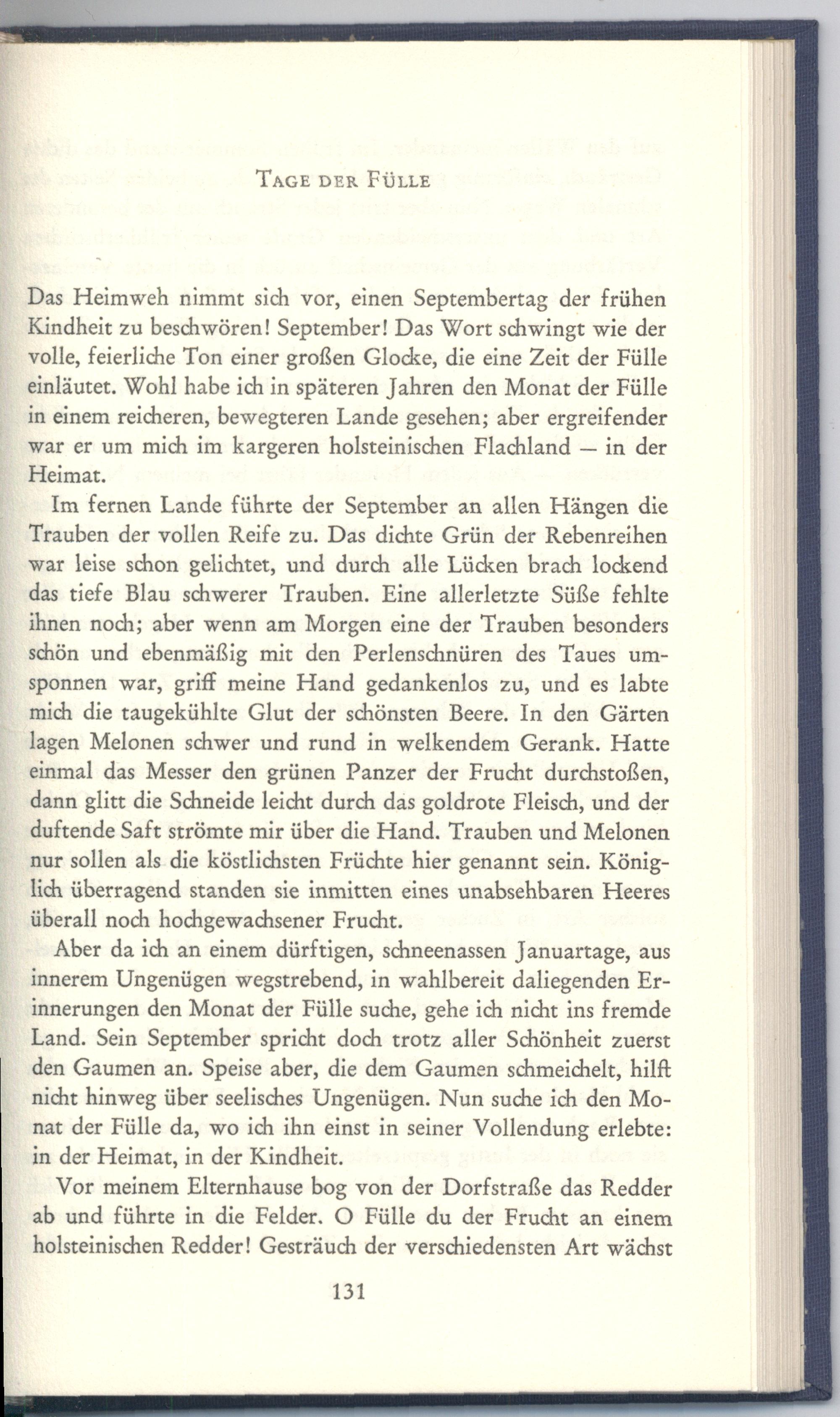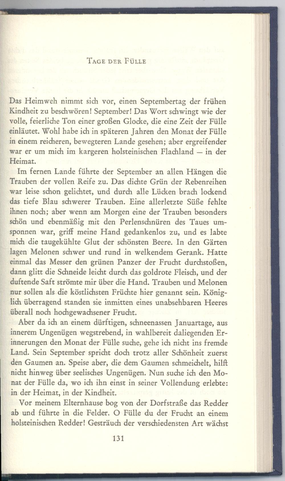 Aber da ich an einem dürftigen, schneenassen Januartage, aus innerem Ungenügen wegstrebend, in wahlbereit daliegenden Erinnerungen den Monat der Fülle suche, gehe ich nicht ins fremde Land. Sein September spricht doch trotz aller Schönheit zuerst den Gaumen an. Speise aber, die dem Gaumen schmeichelt, hilft nicht hinweg über seelisches Ungenügen. Nun suche ich den Monat der Fülle da, wo ich ihn einst in seiner Vollendung erlebte: in der Heimat, in der Kindheit.