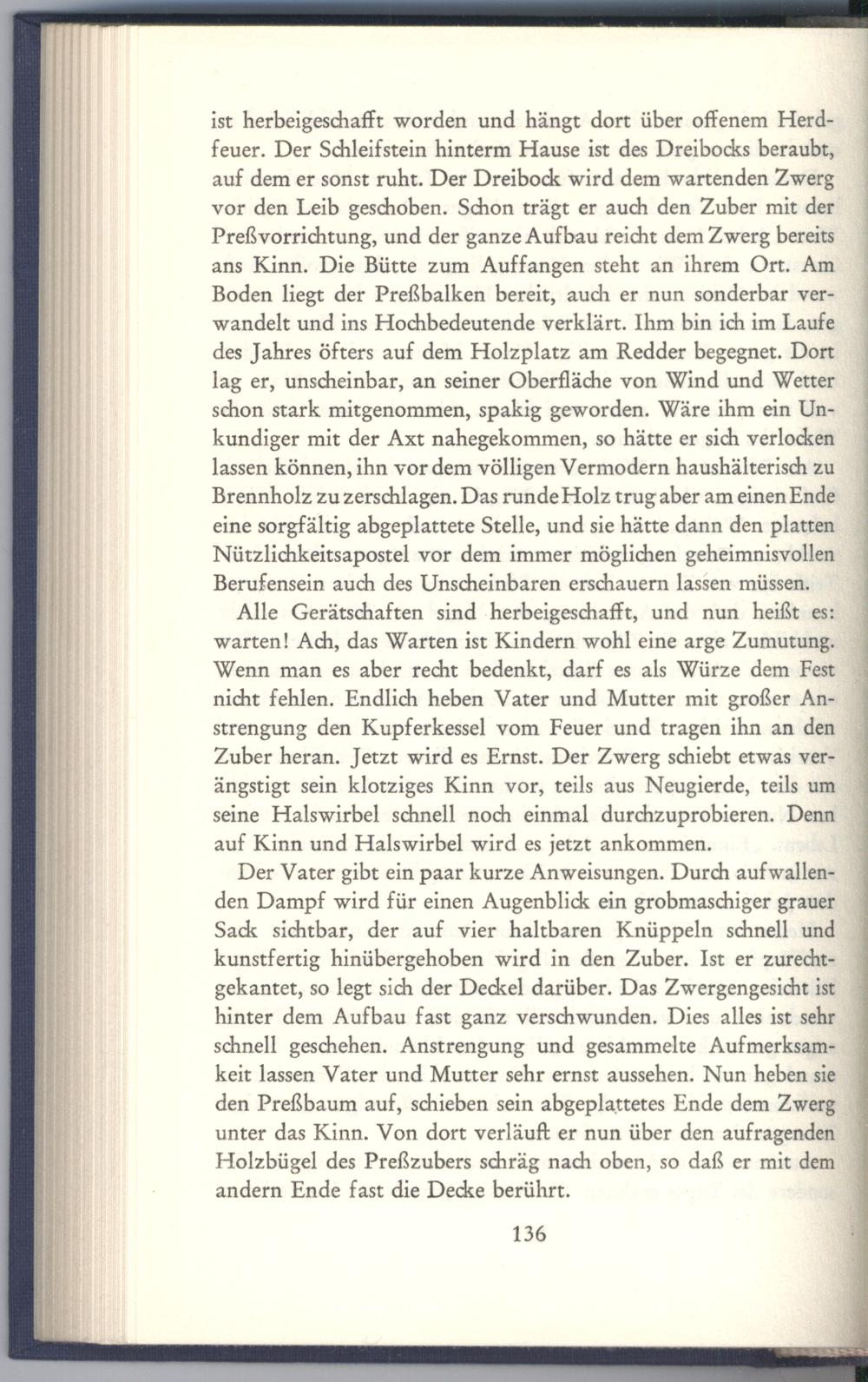 ist herbeigeschafft worden und hängt dort über offenem Herdfeuer. Der Schleifstein hinterm Hause ist des Dreibocks beraubt, auf dem er sonst ruht. Der Dreibock wird dem wartenden Zwerg vor den Leib geschoben. Schon trägt er auch den Zuber mit der Preßvorrichtung, und der ganze Aufbau reicht dem Zwerg bereits ans Kinn. Die Bütte zum Auffangen steht an ihrem Ort. Am Boden liegt der Preßbalken bereit, auch er nun sonderbar verwandelt und ins Hochbedeutende verklärt. Ihm bin ich im Laufe des Jahres öfters auf dem Holzplatz am Redder begegnet. Dort lag er, unscheinbar, an seiner Oberfläche von Wind und Wetter schon stark mitgenommen, spakig geworden. Wäre ihm ein Unkundiger mit der Axt nahegekommen, so hätte er sich verlocken lassen können, ihn vor dem völligen Vermodern haushälterisch zu Brennholz zu zerschlagen. Das runde Holz trug aber am einen Ende eine sorgfältig abgeplattete Stelle, und sie hätte dann den platten Nützlichkeitsapostel vor dem immer möglichen geheimnisvollen Berufensein auch des Unscheinbaren erschauern lassen müssen.