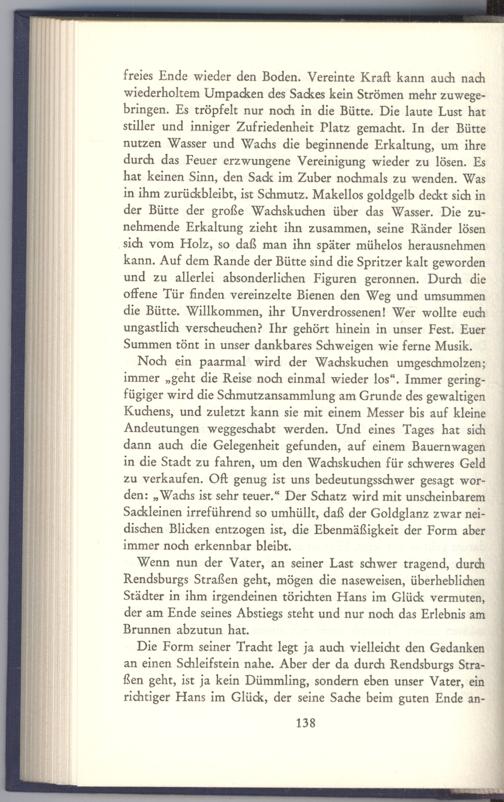 Wenn nun der Vater, an seiner Last schwer tragend, durch Rendsburgs Straßen geht, mögen die naseweisen, überheblichen Städter in ihm irgendeinen törichten Hans im Glück vermuten, der am Ende seines Abstiegs steht und nur noch das Erlebnis am Brunnen abzutun hat.|