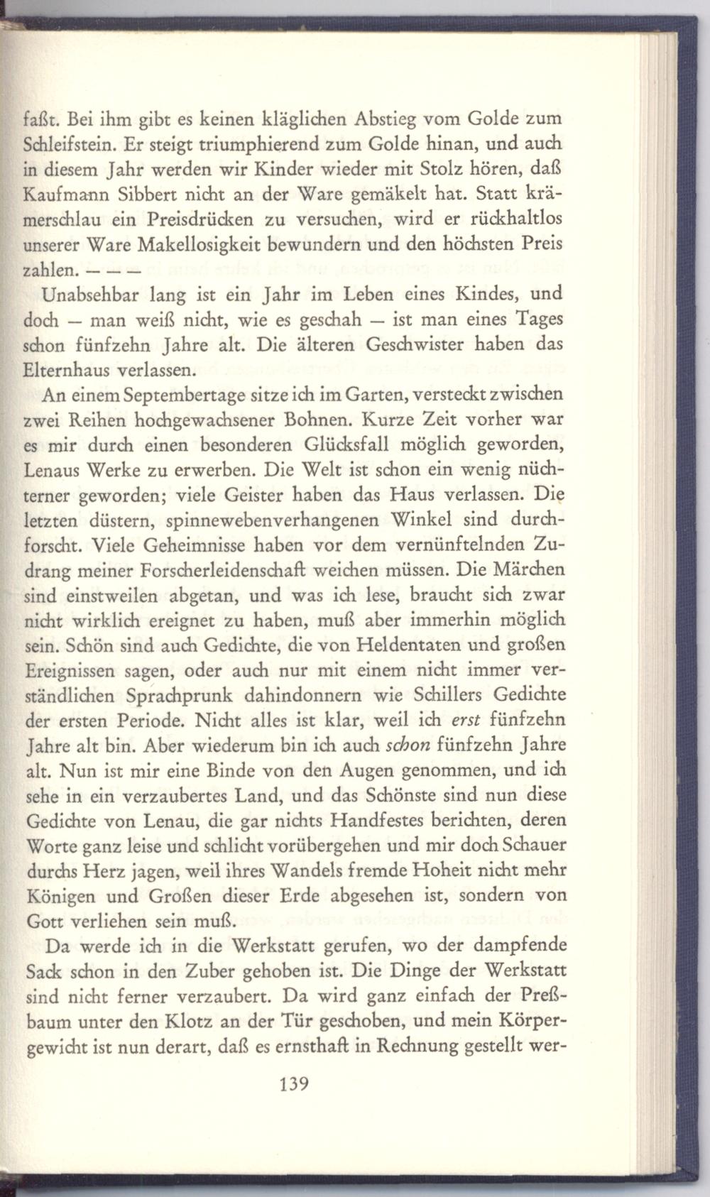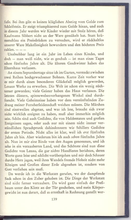 An einem Septembertage sitze ich im Garten, versteckt zwischen zwei Reihen hochgewachsener Bohnen. Kurze Zeit vorher war es mir durch einen besonderen Glücksfall möglich geworden, Lenaus Werke zu erwerben. Die Welt ist schon ein wenig nüchterner geworden; viele Geister haben das Haus verlassen. Die letzten düstern, spinnewebenverhangenen Winkel sind durchforscht. Viele Geheimnisse haben vor dem vernünftelnden Zudrang meiner Forscherleidenschaft weichen müssen. Die Märchen sind einstweilen abgetan, und was ich lese, braucht sich zwar nicht wirklich ereignet zu haben, muß aber immerhin möglich sein. Schön sind auch Gedichte, die von Heldentaten und großen Ereignissen sagen, oder auch nur mit einem nicht immer verständlichen Sprachprunk dahindonnern wie Schillers Gedichte der ersten Periode. Nicht alles ist klar, weil ich erst fünfzehn Jahre alt bin. Aber wiederum bin ich auch schon fünfzehn Jahre alt. Nun ist mir eine Binde von den Augen genommen, und ich sehe in ein verzaubertes Land, und das Schönste sind nun diese Gedichte von Lenau, die gar nichts Handfestes berichten, deren Worte ganz leise und schlicht vorübergehen und mir doch Schauer durchs Herz jagen, weil ihres Wandels fremde Hoheit nicht mehr Königen und Großen dieser Erde abgesehen ist, sondern von Gott verliehen sein muß.