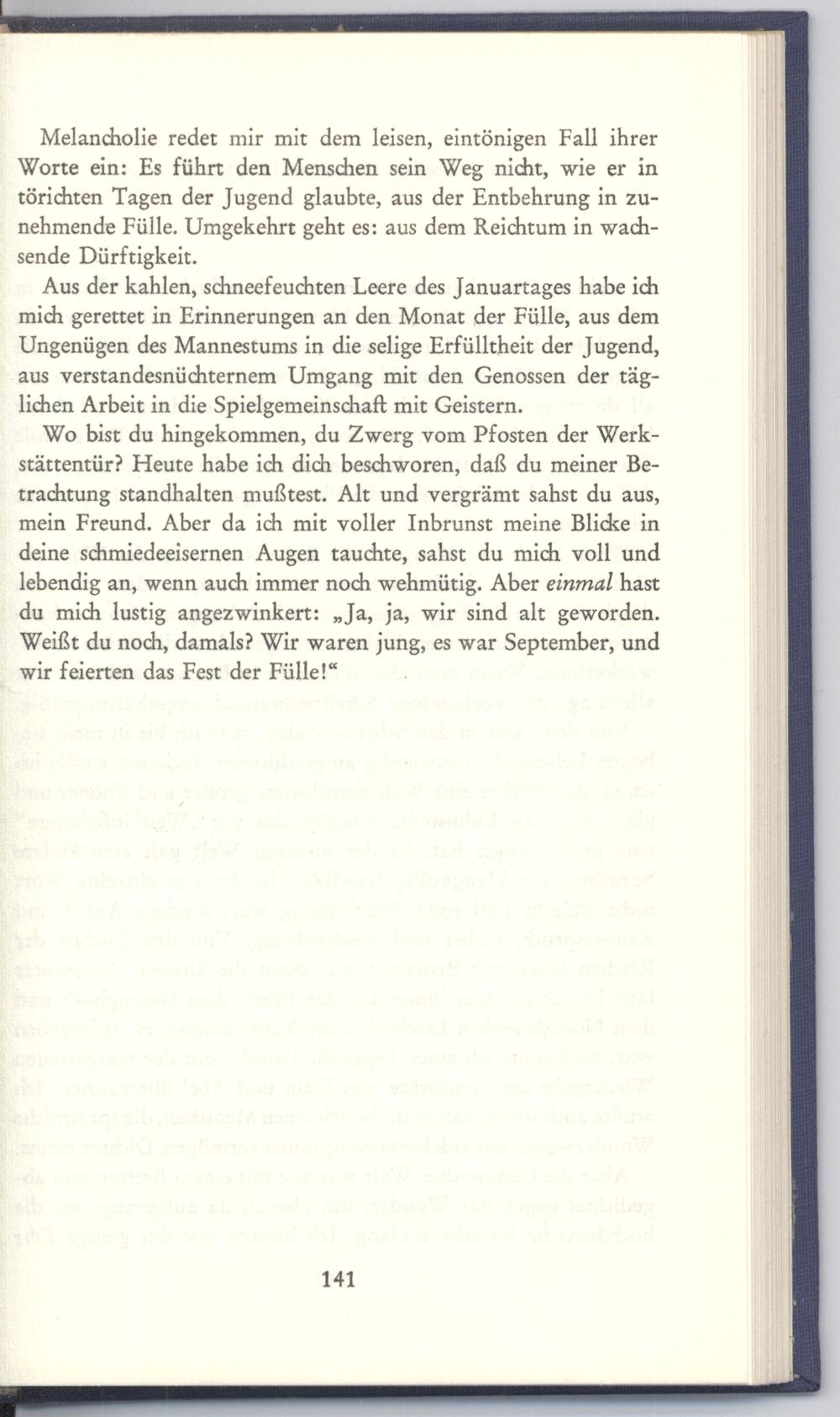 Aus der kahlen, schneefeuchten Leere des Januartages habe ich mich gerettet in Erinnerungen an den Monat der Fülle, aus dem Ungenügen des Mannestums in die selige Erfülltheit der Jugend, aus verstandesnüchternem Umgang mit den Genossen der täglichen Arbeit in die Spielgemeinschaft mit Geistern.