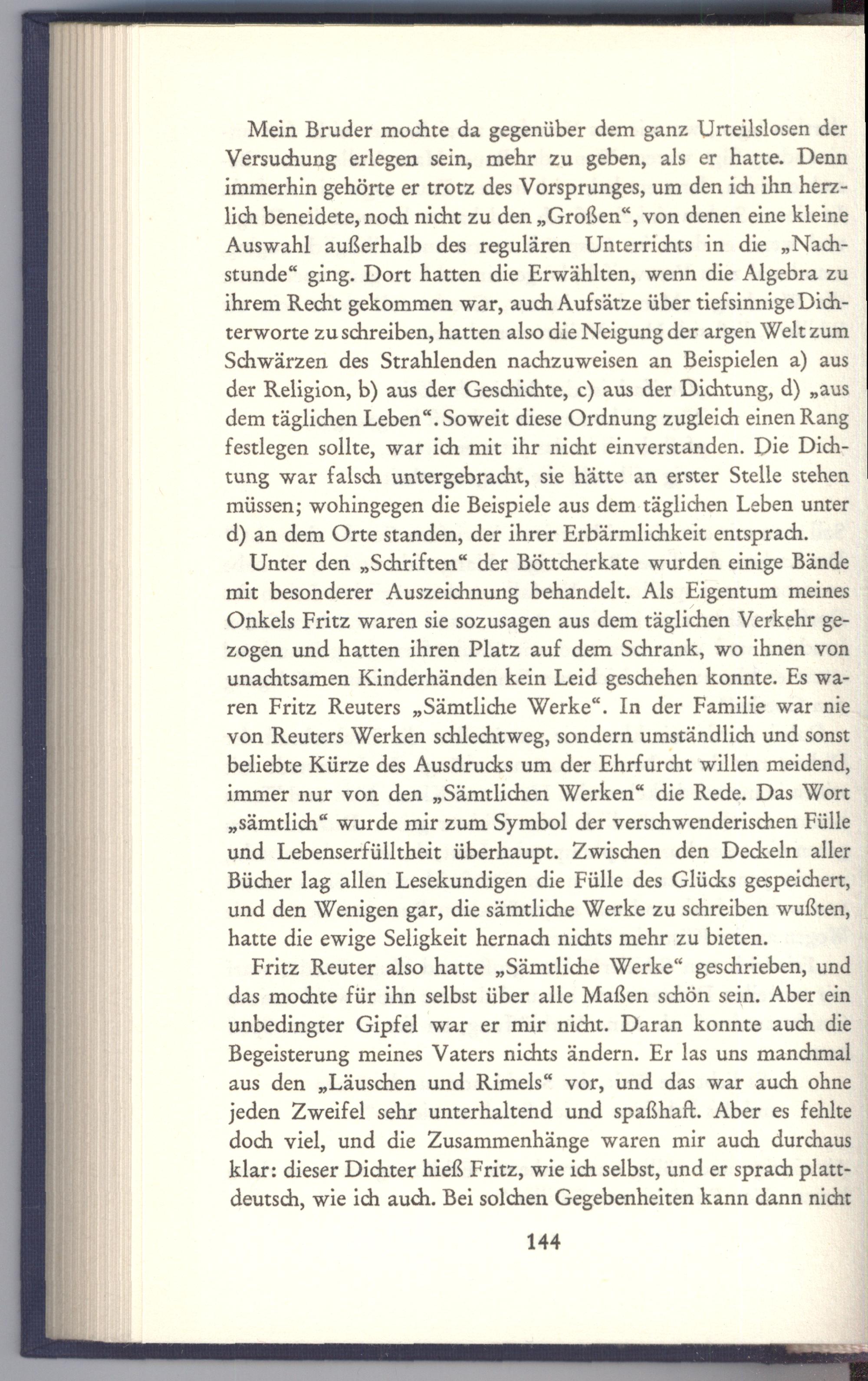 Unter den„Schriften“ der Böttcherkate wurden einige Bände mit besonderer Auszeichnung behandelt. Als Eigentum meines Onkels Fritz waren sie sozusagen aus dem täglichen Verkehr gezogen und hatten ihren Platz auf dem Schrank, wo ihnen von unachtsamen Kinderhänden kein Leid geschehen konnte. Es waren Fritz Reuters„Sämtliche Werke“. In der Familie war nie von Reuters Werken schlechtweg, sondern umständlich und sonst beliebte Kürze des Ausdrucks um der Ehrfurcht willen meidend, immer nur von den„Sämtlichen Werken“ die Rede. Das Wort „sämtlich“ wurde mir zum Symbol der verschwenderischen Fülle und Lebenserfülltheit überhaupt. Zwischen den Deckeln aller Bücher lag allen Lesekundigen die Fülle des Glücks gespeichert,