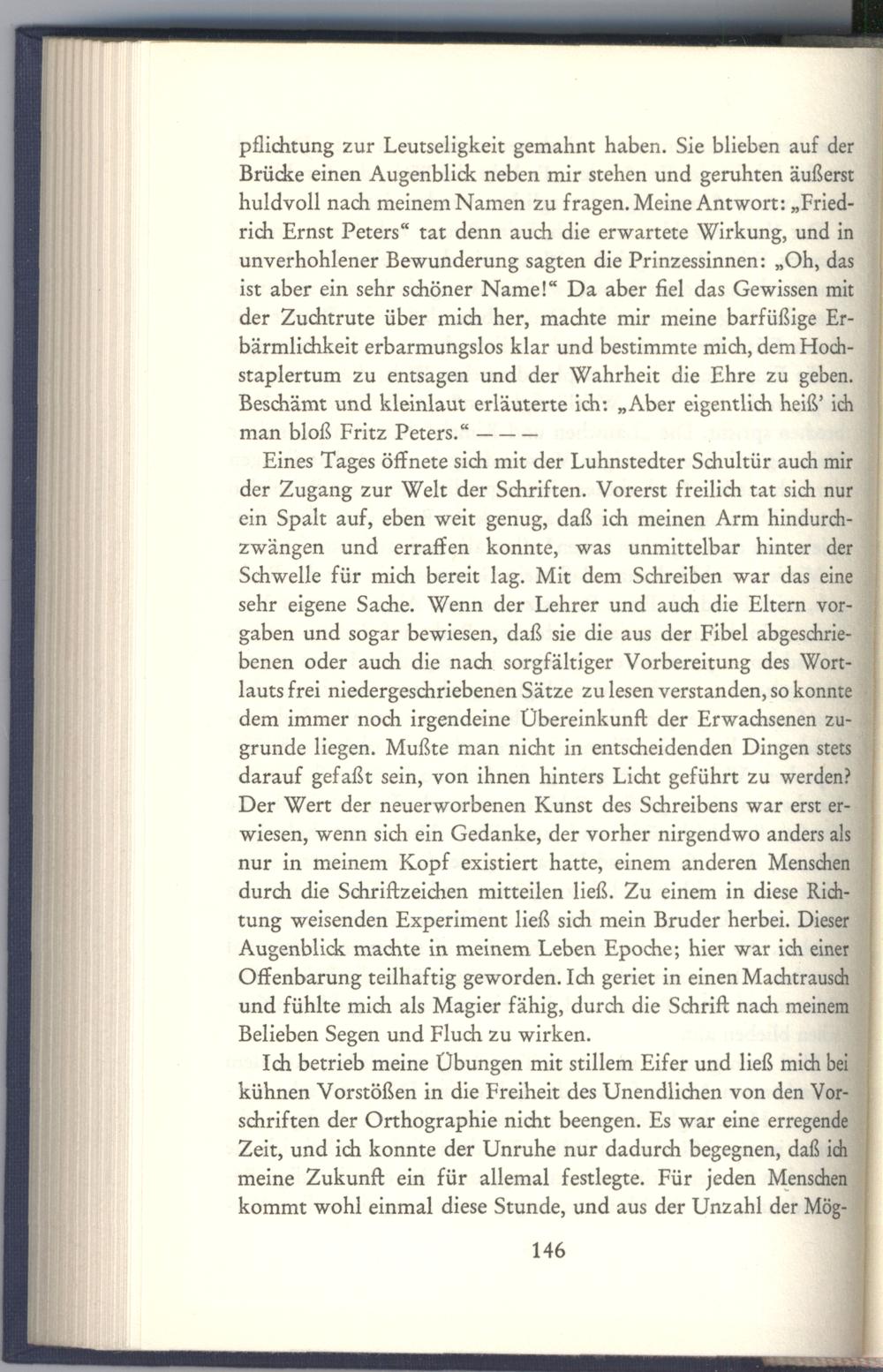 Eines Tages öffnete sich mit der Luhnstedter Schultür auch mir| der Zugang zur Welt der Schriften. Vorerst freilich tat sich nur ein Spalt auf, eben weit genug, daß ich meinen Arm hindurchzwängen und erraffen konnte, was unmittelbar hinter der Schwelle für mich bereit lag. Mit dem Schreiben war das eine sehr eigene Sache. Wenn der Lehrer und auch die Eltern vorgaben und sogar bewiesen, daß sie die aus der Fibel abgeschrie-_ benen oder auch die nach sorgfältiger Vorbereitung des Wortlauts frei niedergeschriebenen Sätze zu lesen verstanden, so konnte_ dem immer noch irgendeine Übereinkunft der Erwachsenen zugrunde liegen. Mußte man nicht in entscheidenden Dingen stets darauf gefaßt sein, von ihnen hinters Licht geführt zu werden?_ Der Wert der neuerworbenen Kunst des Schreibens war erst erwiesen, wenn sich ein Gedanke, der vorher nirgendwo anders als nur in meinem Kopf existiert hatte, einem anderen Menschen durch die Schriftzeichen mitteilen ließ. Zu einem in diese Richtung weisenden Experiment ließ sich mein Bruder herbei. Di Augenblick machte in meinem Leben Epoche; hier war ich ei Offenbarung teilhaftig geworden. Ich geriet in einen Machtra und fühlte mich als Magier fähig, durch die Schrift nach mei Belieben Segen und Fluch zu wirken.