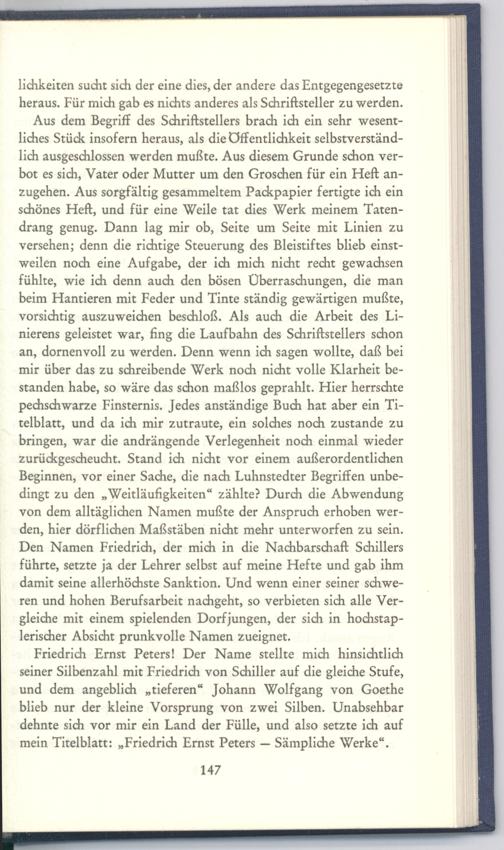 Friedrich Ernst Peters! Der Name stellte mich hinsichtlich seiner Silbenzahl mit Friedrich von Schiller auf die gleiche Stufe, und dem angeblich„tieferen“ Johann Wolfgang von Goethe blieb nur der kleine Vorsprung von zwei Silben. Unabsehbar dehnte sich vor mir ein Land der Fülle, und also setzte ich auf mein Titelblatt:„Friedrich Ernst Peters— Sämpliche Werke“.