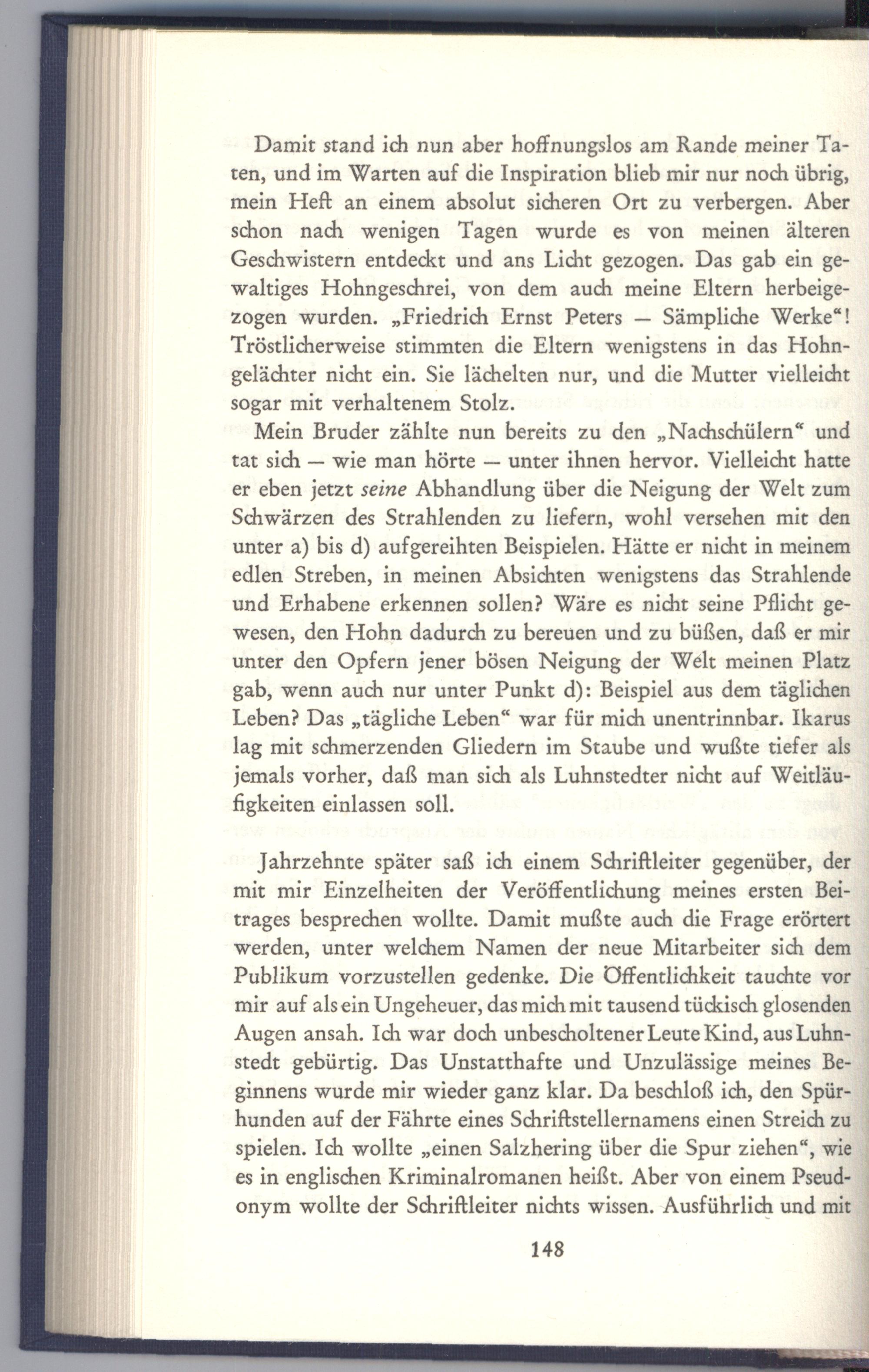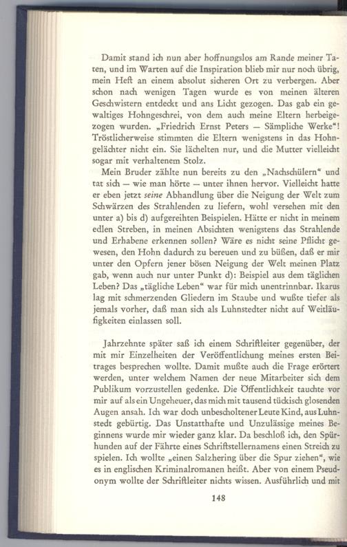 Damit stand ich nun aber hoffnungslos am Rande meiner Taten, und im Warten auf die Inspiration blieb mir nur noch übrig, mein Heft an einem absolut sicheren Ort zu verbergen. Aber schon nach wenigen Tagen wurde es von meinen älteren Geschwistern entdeckt und ans Licht gezogen. Das gab ein gewaltiges Hohngeschrei, von dem auch meine Eltern herbeigezogen wurden.„Friedrich Ernst Peters— Sämpliche Werke“! Tröstlicherweise stimmten die Eltern wenigstens in das Hohngelächter nicht ein. Sie lächelten nur, und die Mutter vielleicht sogar mit verhaltenem Stolz.