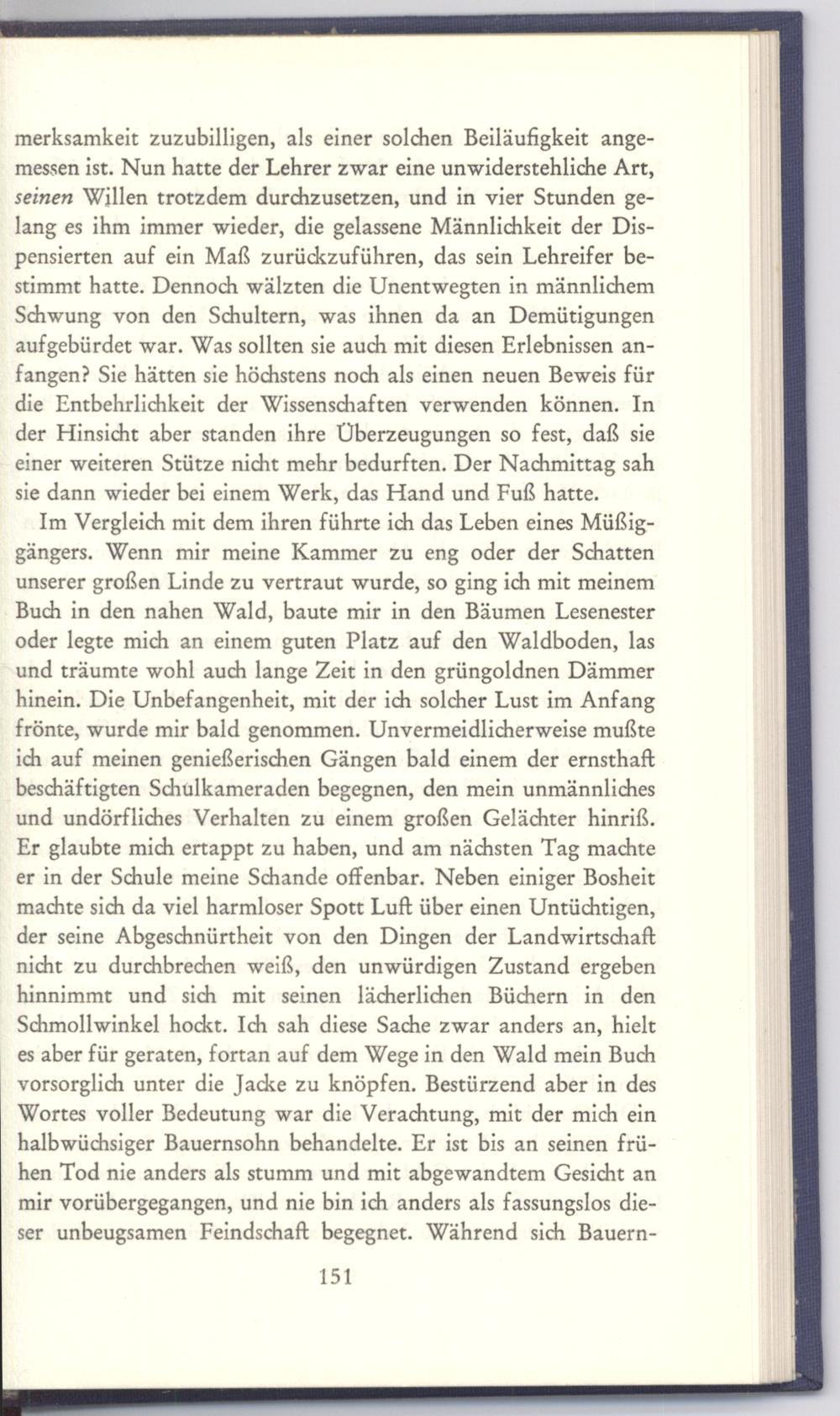 Im Vergleich mit dem ihren führte ich das Leben eines Müßiggängers. Wenn mir meine Kammer zu eng oder der Schatten unserer großen Linde zu vertraut wurde, so ging ich mit meinem Buch in den nahen Wald, baute mir in den Bäumen Lesenester oder legte mich an einem guten Platz auf den Waldboden, las und träumte wohl auch lange Zeit in den grüngoldnen Dämmer hinein. Die Unbefangenheit, mit der ich solcher Lust im Anfang frönte, wurde mir bald genommen. Unvermeidlicherweise mußte ich auf meinen genießerischen Gängen bald einem der ernsthaft beschäftigten Schülkameraden begegnen, den mein unmännliches und undörfliches Verhalten zu einem großen Gelächter hinriß. Er glaubte mich ertappt zu haben, und am nächsten Tag machte er in der Schule meine Schande offenbar. Neben einiger Bosheit machte sich da viel harmloser Spott Luft über einen Untüchtigen, der seine Abgeschnürtheit von den Dingen der Landwirtschaft nicht zu durchbrechen weiß, den unwürdigen Zustand ergeben hinnimmt und sich mit seinen lächerlichen Büchern in den Schmollwinkel hockt. Ich sah diese Sache zwar anders an, hielt es aber für geraten, fortan auf dem Wege in den Wald mein Buch vorsorglich unter die Jacke zu knöpfen. Bestürzend aber in des Wortes voller Bedeutung war die Verachtung, mit der mich ein halbwüchsiger Bauernsohn behandelte. Er ist bis an seinen frühen Tod nie anders als stumm und mit abgewandtem Gesicht an mir vorübergegangen, und nie bin ich anders als fassungslos dieser unbeugsamen Feindschaft begegnet. Während sich Bauern