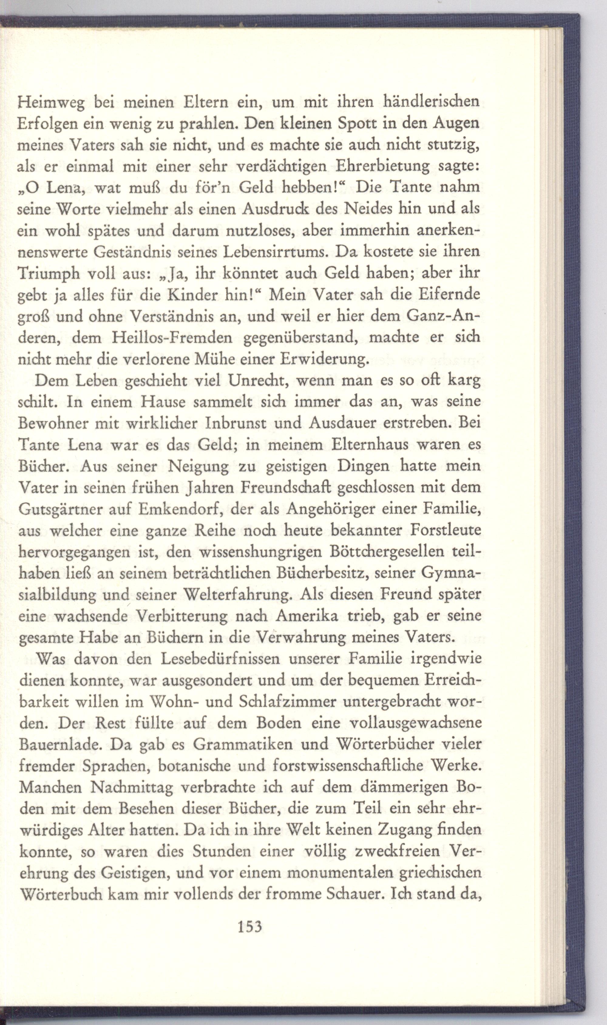 Was davon den Lesebedürfnissen unserer Familie irgendwie dienen konnte, war ausgesondert und um der bequemen Erreichbarkeit willen im Wohn- und Schlafzimmer untergebracht worden. Der Rest füllte auf dem Boden eine vollausgewachsene Bauernlade. Da gab es Grammatiken und Wörterbücher vieler fremder Sprachen, botanische und forstwissenschaftliche Werke. Manchen Nachmittag verbrachte ich auf dem dämmerigen Boden mit dem Besehen dieser Bücher, die zum Teil ein sehr ehrwürdiges Alter hatten. Da ich in ihre Welt keinen Zugang finden konnte, so waren dies Stunden einer völlig zweckfreien Verehrung des Geistigen, und vor einem monumentalen griechischen Wörterbuch kam mir vollends der fromme Schauer. Ich stand da,