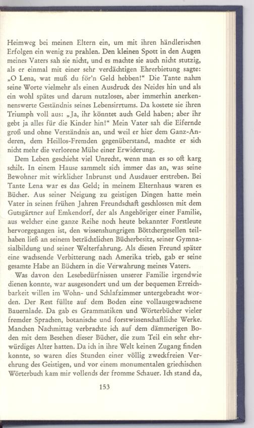 Heimweg bei meinen Eltern ein, um mit ihren händlerischen Erfolgen ein wenig zu prahlen. Den kleinen Spott in den Augen meines Vaters sah sie nicht, und es machte sie auch nicht stutzig, als er einmal mit einer sehr verdächtigen Ehrerbietung sagte: „O Lena, wat muß du för’n Geld hebben!“ Die Tante nahm seine Worte vielmehr als einen Ausdruck des Neides hin und als ein wohl spätes und darum nutzloses, aber immerhin anerkennenswerte Geständnis seines Lebensirrtums. Da kostete sie ihren Triumph voll aus:„Ja, ihr könntet auch Geld haben; aber ihr gebt ja alles für die Kinder hin!“ Mein Vater sah die Eifernde groß und ohne Verständnis an, und weil er hier dem Ganz-Anderen, dem Heillos-Fremden gegenüberstand, machte er sich nicht mehr die verlorene Mühe einer Erwiderung.
