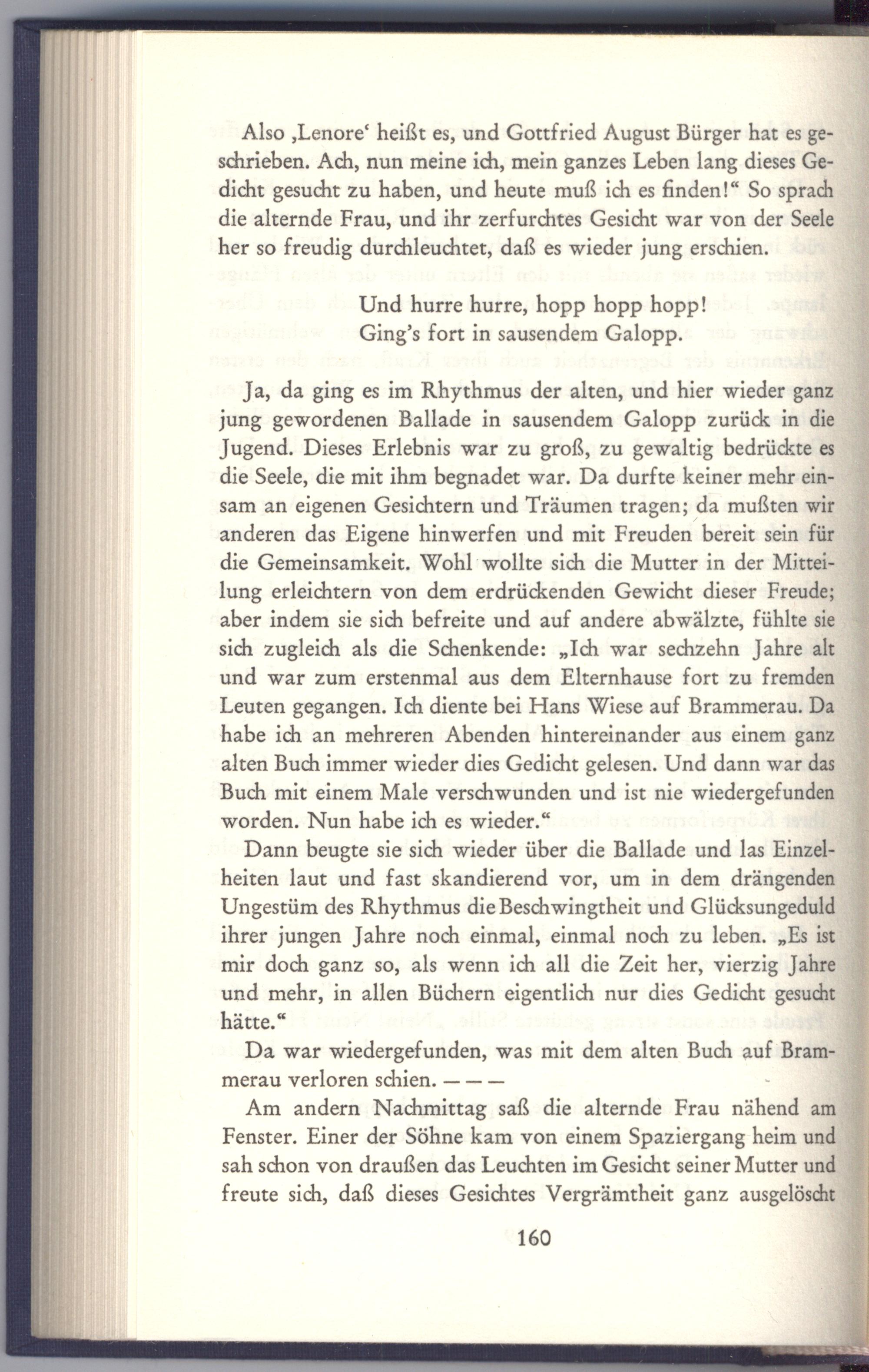 Also ‚Lenore‘ heißt es, und Gottfried August Bürger hat es geschrieben. Ach, nun meine ich, mein ganzes Leben lang dieses Gedicht gesucht zu haben, und heute muß ich es finden!“ So sprach die alternde Frau, und ihr zerfurchtes Gesicht war von der Seele her so freudig durchleuchtet, daß es wieder jung erschien.