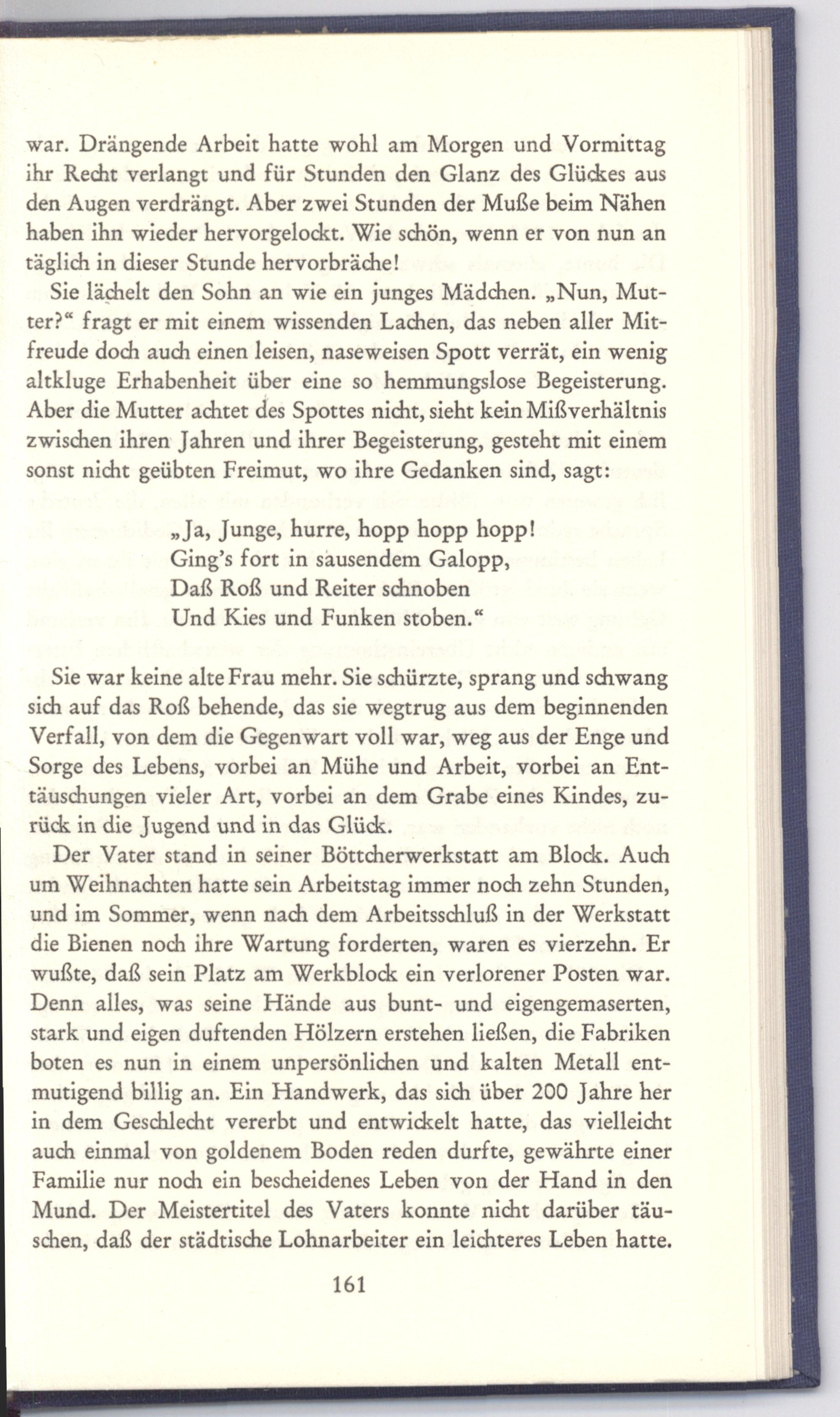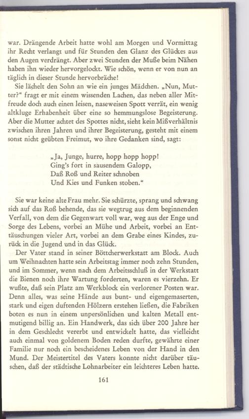 Der Vater stand in seiner Böttcherwerkstatt am Block. Auch um Weihnachten hatte sein Arbeitstag immer noch zehn Stunden, und im Sommer, wenn nach dem Arbeitsschluß in der Werkstatt die Bienen noch ihre Wartung forderten, waren es vierzehn. Er wußte, daß sein Platz am Werkblock ein verlorener Posten war. Denn alles, was seine Hände aus bunt- und eigengemaserten, stark und eigen duftenden Hölzern erstehen ließen, die Fabriken boten es nun in einem unpersönlichen und kalten Metall entmutigend billig an. Ein Handwerk, das sich über 200 Jahre her in dem Geschlecht vererbt und entwickelt hatte, das vielleicht auch einmal von goldenem Boden reden durfte, gewährte einer Familie nur noch ein bescheidenes Leben von der Hand in den Mund. Der Meistertitel des Vaters konnte nicht darüber täuschen, daß der städtische Lohnarbeiter ein leichteres Leben hatte.