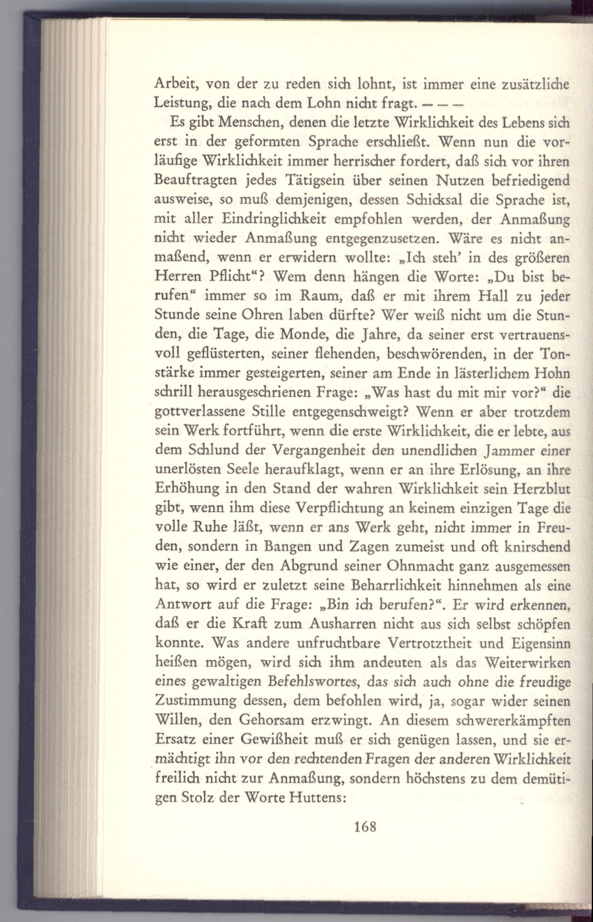 Es gibt Menschen, denen die letzte Wirklichkeit des Lebens sich erst in der geformten Sprache erschließt. Wenn nun die vorläufige Wirklichkeit immer herrischer fordert, daß sich vor ihren Beauftragten jedes Tätigsein über seinen Nutzen befriedigend ausweise, so muß demjenigen, dessen Schicksal die Sprache ist, mit aller Eindringlichkeit empfohlen werden, der Anmaßung nicht wieder Anmaßung entgegenzusetzen. Wäre es nicht anmaßend, wenn er erwidern wollte:„Ich steh” in des größeren Herren Pflicht“? Wem denn hängen die Worte:„Du bist berufen“ immer so im Raum, daß er mit ihrem Hall zu jeder Stunde seine Ohren laben dürfte? Wer weiß nicht um die Stunden, die Tage, die Monde, die Jahre, da seiner erst vertrauensvoll geflüsterten, seiner flehenden, beschwörenden, in der Tonstärke immer gesteigerten, seiner am Ende in lästerlichem Hohn schrill herausgeschrienen Frage:„Was hast du mit mir vor?“ die gottverlassene Stille entgegenschweigt? Wenn er aber trotzdem sein Werk fortführt, wenn die erste Wirklichkeit, die er lebte, aus dem Schlund der Vergangenheit den unendlichen Jammer einer unerlösten Seele heraufklagt, wenn er an ihre Erlösung, an ihre Erhöhung in den Stand der wahren Wirklichkeit sein Herzblut gibt, wenn ihm diese Verpflichtung an keinem einzigen Tage die volle Ruhe läßt, wenn er ans Werk geht, nicht immer in Freuden, sondern in Bangen und Zagen zumeist und oft knirschend wie einer, der den Abgrund seiner Ohnmacht ganz ausgemessen hat, so wird er zuletzt seine Beharrlichkeit hinnehmen als eine Antwort auf die Frage:„Bin ich berufen?“. Er wird erkennen, daß er die Kraft zum Ausharren nicht aus sich selbst schöpfen konnte. Was andere unfruchtbare Vertrotztheit und Eigensinn heißen mögen, wird sich ihm andeuten als das Weiterwirken eines gewaltigen Befehlswortes, das sich auch ohne die freudige Zustimmung dessen, dem befohlen wird, ja, sogar wider seinen Willen, den Gehorsam erzwingt. An diesem schwererkämpften Ersatz einer Gewißheit muß er sich genügen lassen, und sie ermächtigt ihn vor den rechtenden Fragen der anderen Wirklichkeit freilich nicht zur Anmaßung, sondern höchstens zu dem demütigen Stolz der Worte Huttens: