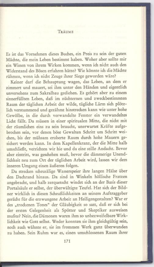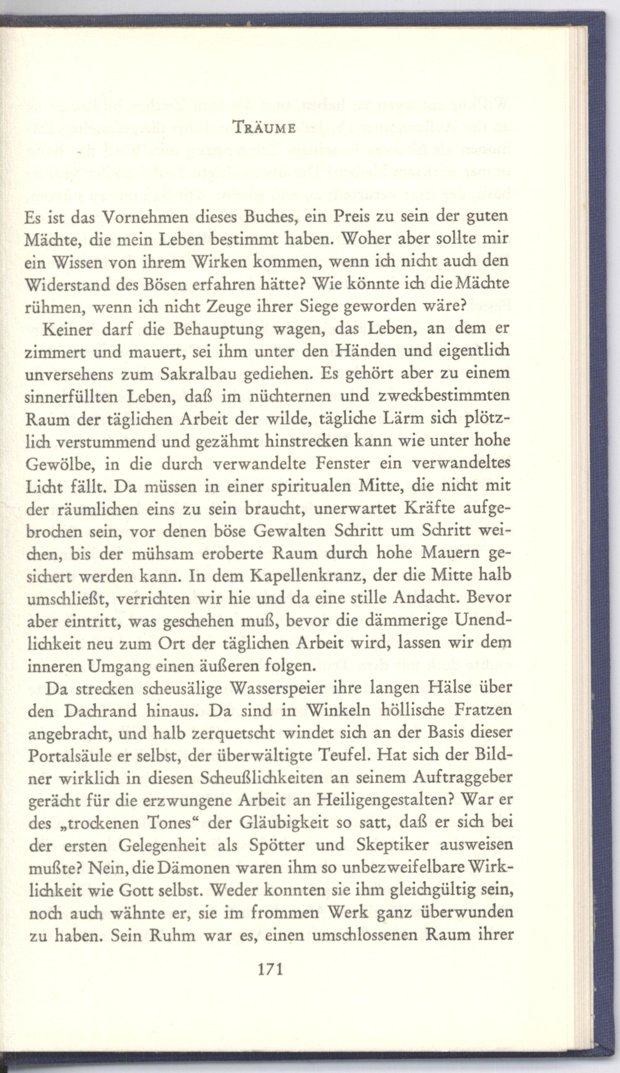 Keiner darf die Behauptung wagen, das Leben, an dem er zimmert und mauert, sei ihm unter den Händen und eigentlich unversehens zum Sakralbau gediehen. Es gehört aber zu einem sinnerfüllten Leben, daß im nüchternen und zweckbestimmten Raum der täglichen Arbeit der wilde, tägliche Lärm sich plötzlich verstummend und gezähmt hinstrecken kann wie unter hohe Gewölbe, in die durch verwandelte Fenster ein verwandeltes Licht fällt. Da müssen in einer spiritualen Mitte, die nicht mit der räumlichen eins zu sein braucht, unerwartet Kräfte aufgebrochen sein, vor denen böse Gewalten Schritt um Schritt weichen, bis der mühsam eroberte Raum durch hohe Mauern gesichert werden kann. In dem Kapellenkranz, der die Mitte halb umschließt, verrichten wir hie und da eine stille Andacht. Bevor aber eintritt, was geschehen muß, bevor die dämmerige Unendlichkeit neu zum Ort der täglichen Arbeit wird, lassen wir dem inneren Umgang einen äußeren folgen.