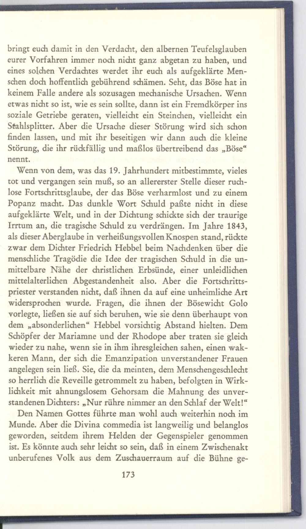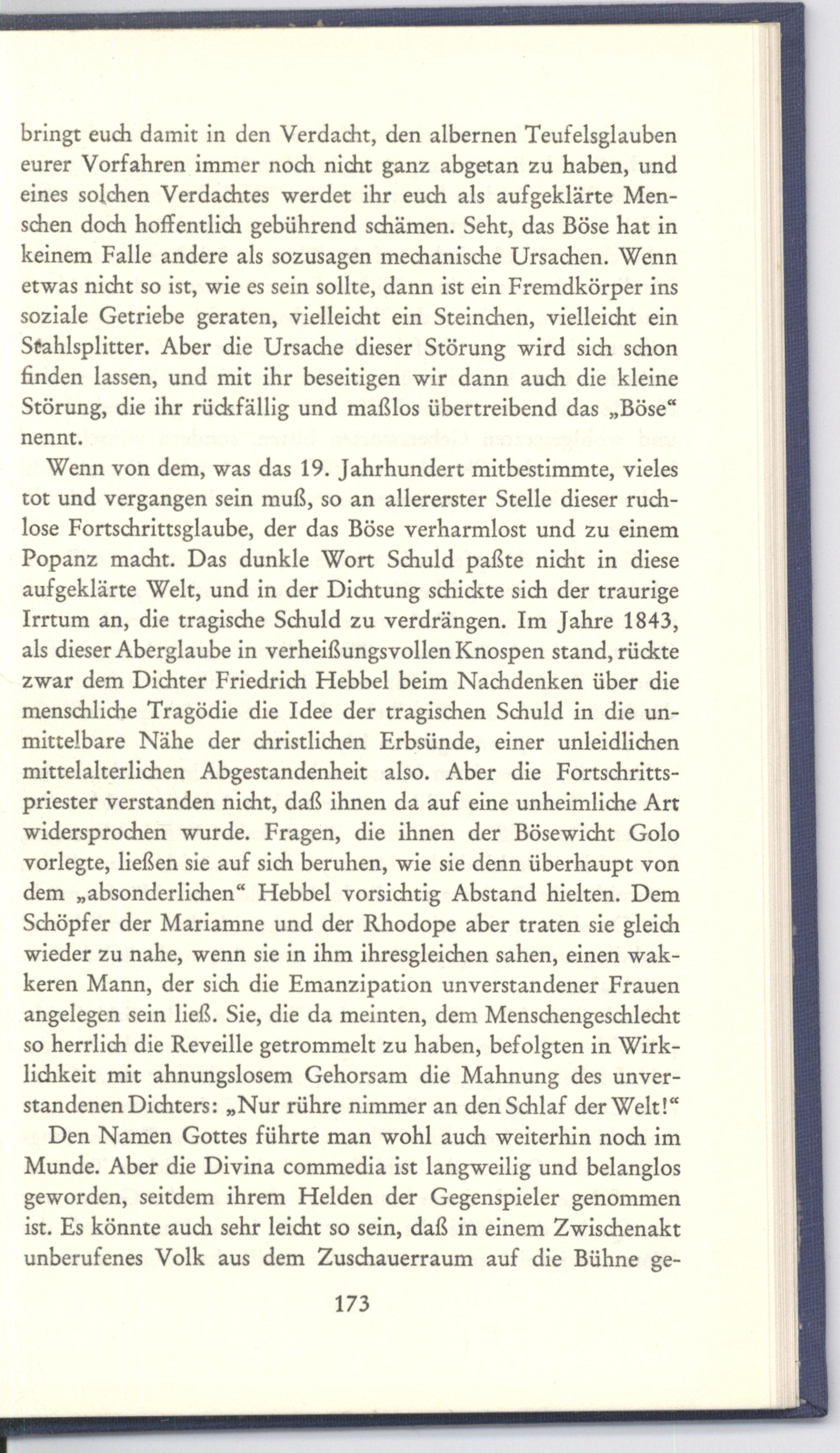 Wenn von dem, was das 19. Jahrhundert mitbestimmte, vieles tot und vergangen sein muß, so an allererster Stelle dieser ruchlose Fortschrittsglaube, der das Böse verharmlost und zu einem Popanz macht. Das dunkle Wort Schuld paßte nicht in diese aufgeklärte Welt, und in der Dichtung schickte sich der traurige Irrtum an, die tragische Schuld zu verdrängen. Im Jahre 1843, als dieser Aberglaube in verheißungsvollen Knospen stand, rückte zwar dem Dichter Friedrich Hebbel beim Nachdenken über die menschliche Tragödie die Idee der tragischen Schuld in die unmittelbare Nähe der christlichen Erbsünde, einer unleidlichen mittelalterlichen Abgestandenheit also. Aber die Fortschrittspriester verstanden nicht, daß ihnen da auf eine unheimliche Art widersprochen wurde. Fragen, die ihnen der Bösewicht Golo vorlegte, ließen sie auf sich beruhen, wie sie denn überhaupt von dem„absonderlichen“ Hebbel vorsichtig Abstand hielten. Dem Schöpfer der Mariamne und der Rhodope aber traten sie gleich wieder zu nahe, wenn sie in ihm ihresgleichen sahen, einen wakkeren Mann, der sich die Emanzipation unverstandener Frauen angelegen sein ließ. Sie, die da meinten, dem Menschengeschlecht so herrlich die Reveille getrommelt zu haben, befolgten in Wirklichkeit mit ahnungslosem Gehorsam die Mahnung des unverstandenen Dichters:„Nur rühre nimmer an den Schlaf der Welt!“