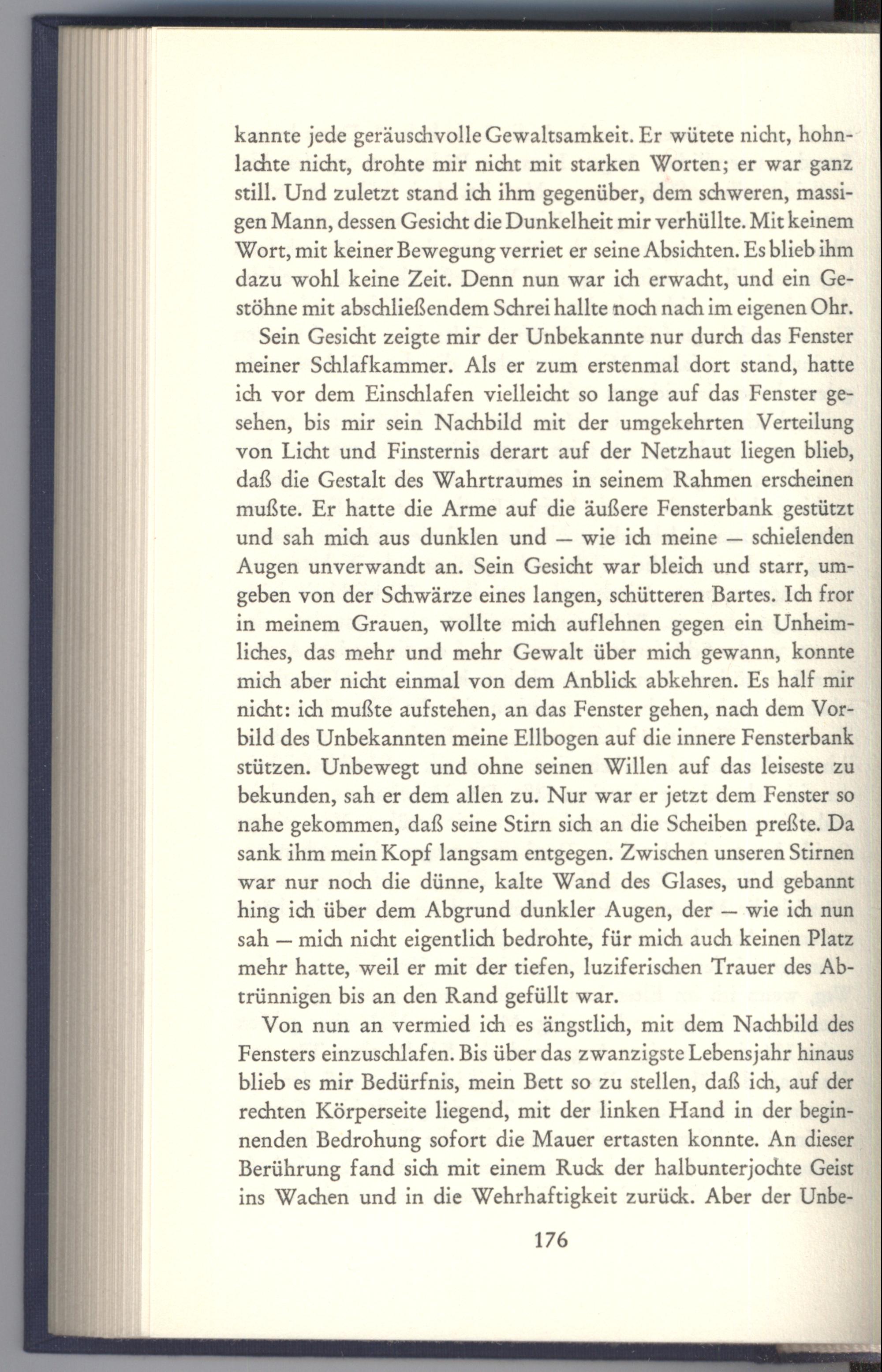 Sein Gesicht zeigte mir der Unbekannte nur durch das Fenster meiner Schlafkammer. Als er zum erstenmal dort stand, hatte ich vor dem Einschlafen vielleicht so lange auf das Fenster gesehen, bis mir sein Nachbild mit der umgekehrten Verteilung von Licht und Finsternis derart auf der Netzhaut liegen blieb, daß die Gestalt des Wahrtraumes in seinem Rahmen erscheinen mußte. Er hatte die Arme auf die äußere Fensterbank gestützt und sah mich aus dunklen und— wie ich meine— schielenden Augen unverwandt an. Sein Gesicht war bleich und starr, umgeben von der Schwärze eines langen, schütteren Bartes. Ich fror in meinem Grauen, wollte mich auflehnen gegen ein Unheimliches, das mehr und mehr Gewalt über mich gewann, konnte mich aber nicht einmal von dem Anblick abkehren. Es half mir nicht: ich mußte aufstehen, an das Fenster gehen, nach dem Vorbild des Unbekannten meine Ellbogen auf die innere Fensterbank stützen. Unbewegt und ohne seinen Willen auf das leiseste zu bekunden, sah er dem allen zu. Nur war er jetzt dem Fenster so nahe gekommen, daß seine Stirn sich an die Scheiben preßte. Da sank ihm mein Kopf langsam entgegen. Zwischen unseren Stirnen war nur noch die dünne, kalte Wand des Glases, und gebannt hing ich über dem Abgrund dunkler Augen, der— wie ich nun sah— mich nicht eigentlich bedrohte, für mich auch keinen Platz mehr hatte, weil er mit der tiefen, luziferischen Trauer des Abtrünnigen bis an den Rand gefüllt war.