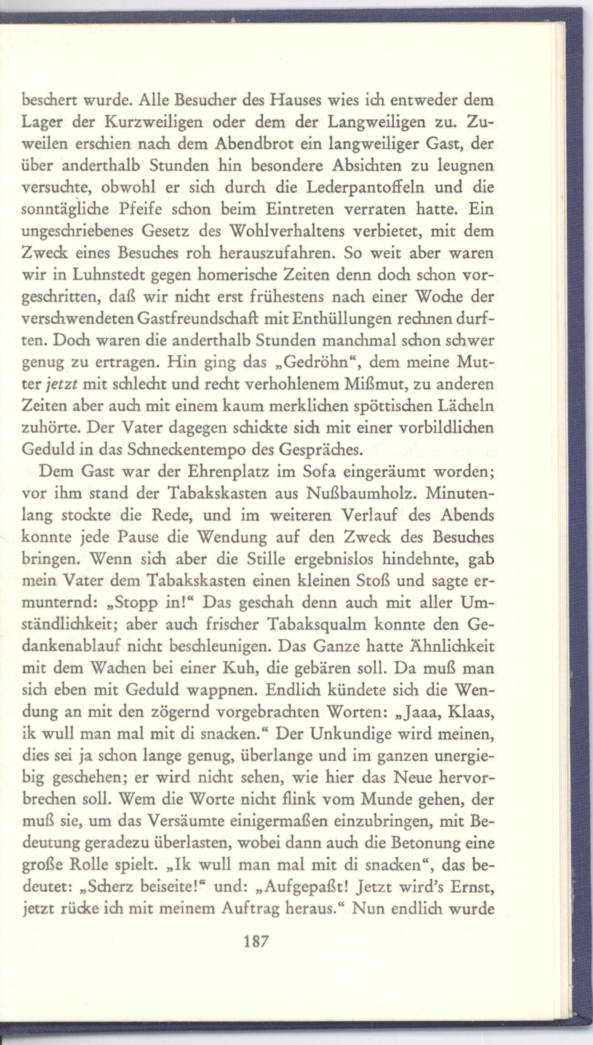 Dem Gast war der Ehrenplatz im Sofa eingeräumt worden; vor ihm stand der Tabakskasten aus Nußbaumholz. Minutenlang stockte die Rede, und im weiteren Verlauf des Abends konnte jede Pause die Wendung auf den Zweck des Besuches bringen. Wenn sich aber die Stille ergebnislos hindehnte, gab mein Vater dem Tabakskasten einen kleinen Stoß und sagte ermunternd:„Stopp in!“ Das geschah denn auch mit aller Umständlichkeit; aber auch frischer Tabaksqualm konnte den Gedankenablauf nicht beschleunigen. Das Ganze hatte Ähnlichkeit mit dem Wachen bei einer Kuh, die gebären soll. Da muß man sich eben mit Geduld wappnen. Endlich kündete sich die Wendung an mit den zögernd vorgebrachten Worten:„Jaaa, Klaas, ik wull man mal mit di snacken.“ Der Unkundige wird meinen, dies sei ja schon lange genug, überlange und im ganzen unergiebig geschehen; er wird nicht sehen, wie hier das Neue hervorbrechen soll. Wem die Worte nicht flink vom Munde gehen, der muß sie, um das Versäumte einigermaßen einzubringen, mit Bedeutung geradezu überlasten, wobei dann auch die Betonung eine große Rolle spielt.„Ik wull man mal mit di snacken“, das bedeutet:„Scherz beiseite!“ und:„Aufgepaßt! Jetzt wird’s Ernst, jetzt rücke ich mit meinem Auftrag heraus.“ Nun endlich wurde