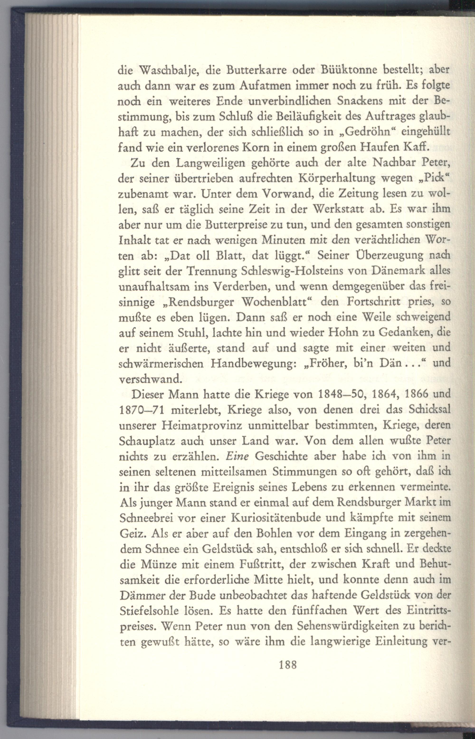 Dieser Mann hatte die Kriege von 1848—50, 1864, 1866 und 1870—71 miterlebt, Kriege also, von denen drei das Schicksal unserer Heimatprovinz unmittelbar bestimmten, Kriege, deren Schauplatz auch unser Land war. Von dem allen wußte Peter nichts zu erzählen. Eine Geschichte aber habe ich von ihm in seinen seltenen mitteilsamen Stimmungen so oft gehört, daß ich in ihr das größte Ereignis seines Lebens zu erkennen vermeinte, Als junger Mann stand er einmal auf dem Rendsburger Markt im Schneebrei vor einer Kuriositätenbude und kämpfte mit seinem Geiz. Als er aber auf den Bohlen vor dem Eingang in zergehendem Schnee ein Geldstück sah, entschloß er sich schnell. Er deckte die Münze mit einem Fußtritt, der zwischen Kraft und Behutsamkeit die erforderliche Mitte hielt, und konnte denn auch im Dämmer der Bude unbeobachtet das haftende Geldstück von der Stiefelsohle lösen. Es hatte den fünffachen Wert des Eintrittspreises. Wenn Peter nun von den Sehenswürdigkeiten zu berichten gewußt hätte, so wäre ihm die langwierige Einleitung ver