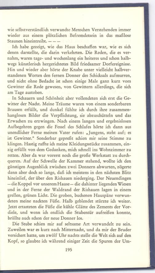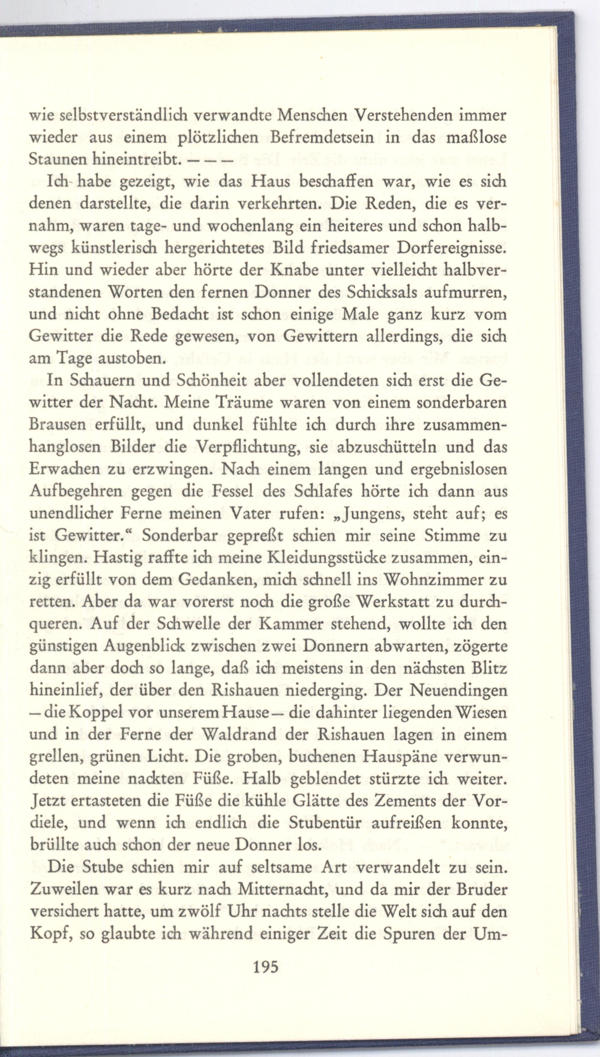 Ich-habe gezeigt, wie das Haus beschaffen war, wie es sich denen darstellte, die darin verkehrten. Die Reden, die es vernahm, waren tage- und wochenlang ein heiteres und schon halbwegs künstlerisch hergerichtetes Bild friedsamer Dorfereignisse. Hin und wieder aber hörte der Knabe unter vielleicht halbverstandenen Worten den fernen Donner des Schicksals aufmurren, und nicht ohne Bedacht ist schon einige Male ganz kurz vom Gewitter die Rede gewesen, von Gewittern allerdings, die sich am Tage austoben.