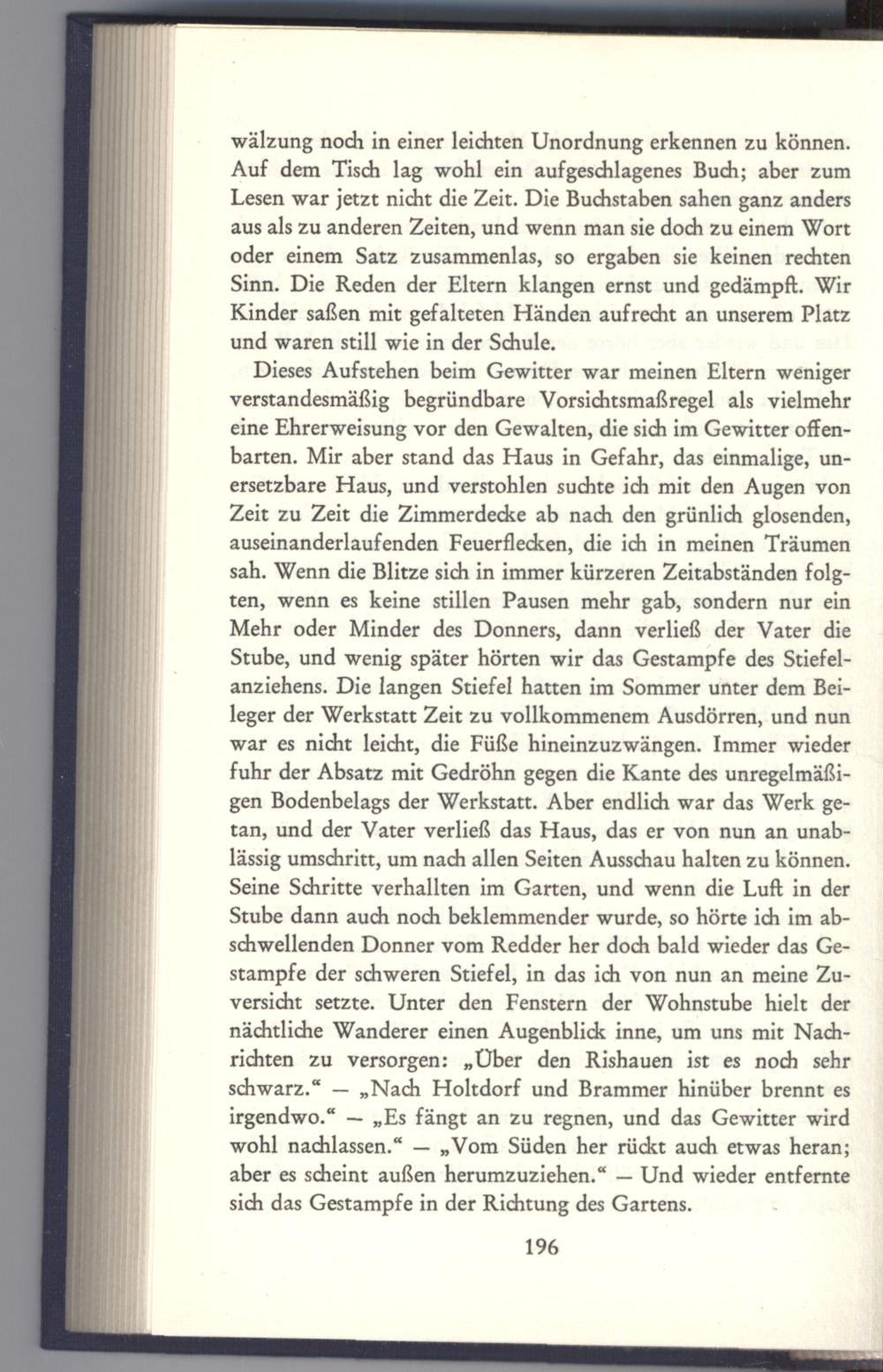 Dieses Aufstehen beim Gewitter war meinen Eltern weniger verstandesmäßig begründbare Vorsichtsmaßregel als vielmehr eine Ehrerweisung vor den Gewalten, die sich im Gewitter offenbarten. Mir aber stand das Haus in Gefahr, das einmalige, unersetzbare Haus, und verstohlen suchte ich mit den Augen von Zeit zu Zeit die Zimmerdecke ab nach den grünlich glosenden, auseinanderlaufenden Feuerflecken, die ich in meinen Träumen sah. Wenn die Blitze sich in immer kürzeren Zeitabständen folgten, wenn es keine stillen Pausen mehr gab, sondern nur ein Mehr oder Minder des Donners, dann verließ der Vater die Stube, und wenig später hörten wir das Gestampfe des Stiefelanziehens. Die langen Stiefel hatten im Sommer unter dem Beileger der Werkstatt Zeit zu vollkommenem Ausdörren, und nun war es nicht leicht, die Füße hineinzuzwängen. Immer wieder fuhr der Absatz mit Gedröhn gegen die Kante des unregelmäßigen Bodenbelags der Werkstatt. Aber endlich war das Werk getan, und der Vater verließ das Haus, das er von nun an unablässig umschritt, um nach allen Seiten Ausschau halten zu können. Seine Schritte verhallten im Garten, und wenn die Luft in der Stube dann auch noch beklemmender wurde, so hörte ich im abschwellenden Donner vom Redder her doch bald wieder das Gestampfe der schweren Stiefel, in das ich von nun an meine Zuversicht setzte. Unter den Fenstern der Wohnstube hielt der nächtliche Wanderer einen Augenblick inne, um uns mit Nachrichten zu versorgen:„Über den Rishauen ist es noch sehr schwarz.“—„Nach Holtdorf und Brammer hinüber brennt es irgendwo.“—„Es fängt an zu regnen, und das Gewitter wird wohl nachlassen.“—„Vom Süden her rückt auch etwas heran; aber es scheint außen herumzuziehen.“— Und wieder entfernte sich das Gestampfe in der Richtung des Gartens.