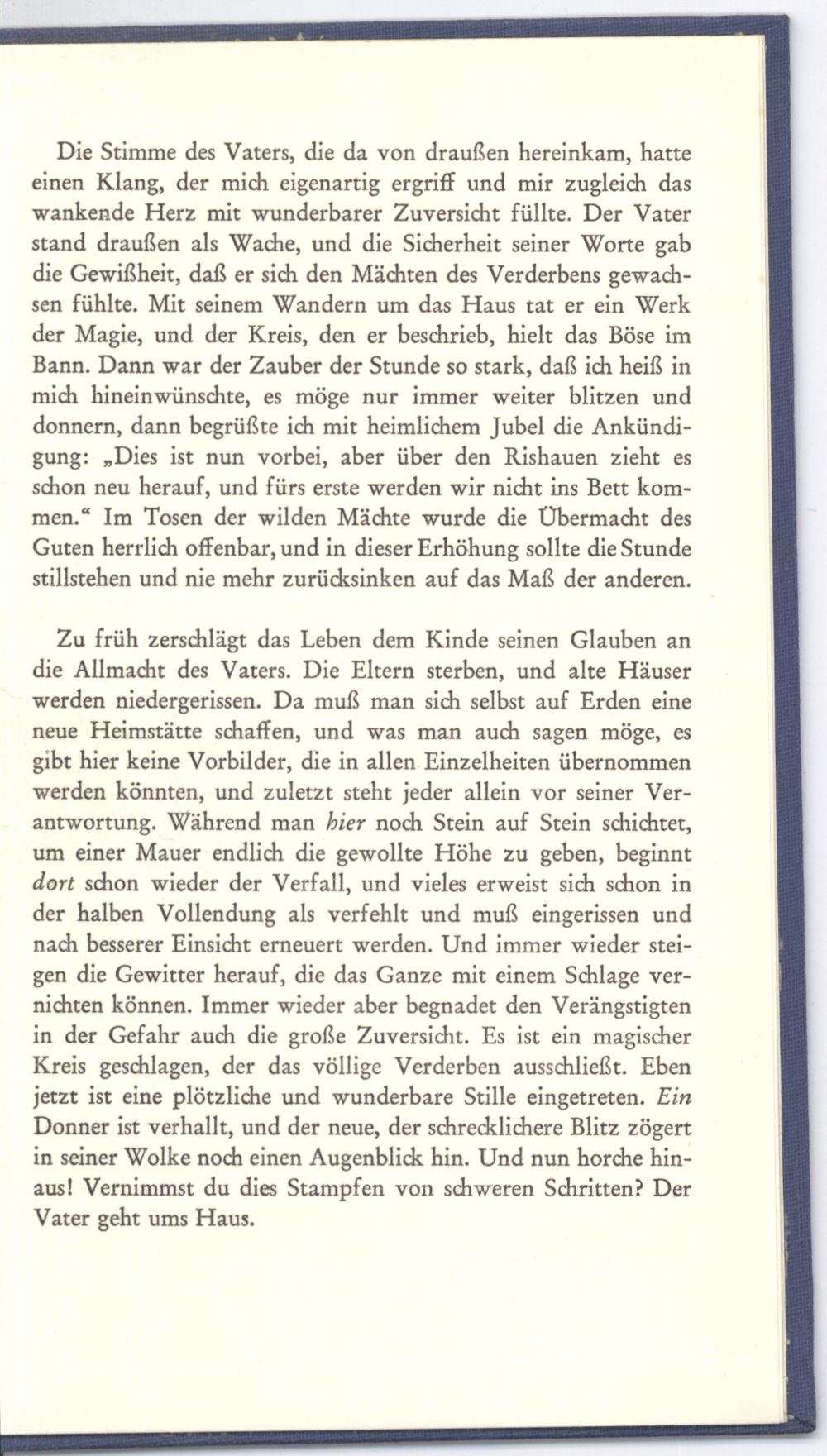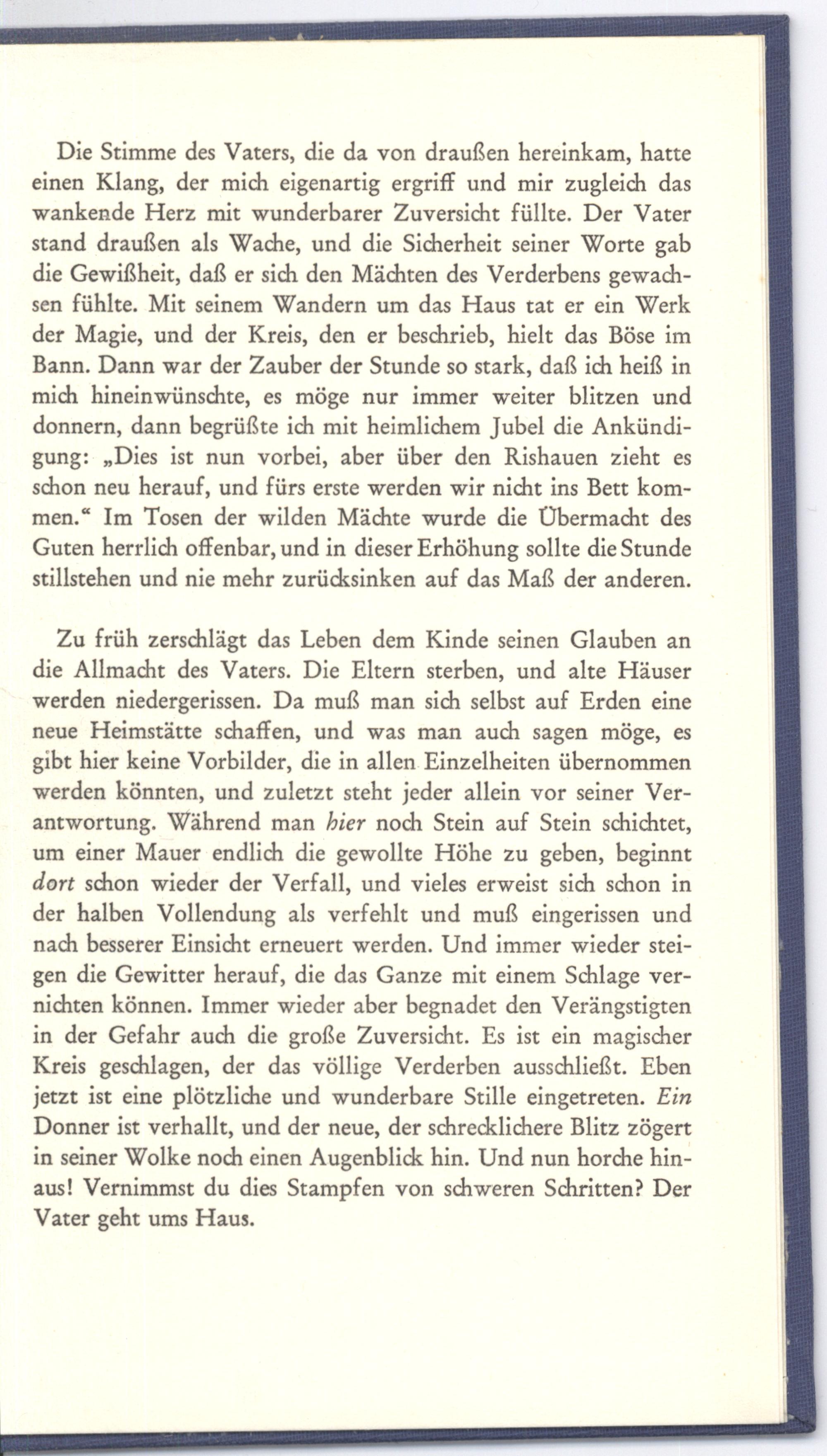 Die Stimme des Vaters, die da von draußen hereinkam, hatte einen Klang, der mich eigenartig ergriff und mir zugleich das wankende Herz mit wunderbarer Zuversicht füllte. Der Vater stand draußen als Wache, und die Sicherheit seiner Worte gab die Gewißheit, daß er sich den Mächten des Verderbens gewachsen fühlte. Mit seinem Wandern um das Haus tat er ein Werk der Magie, und der Kreis, den er beschrieb, hielt das Böse im Bann. Dann war der Zauber der Stunde so stark, daß ich heiß in mich hineinwünschte, es möge nur immer weiter blitzen und donnern, dann begrüßte ich mit heimlichem Jubel die Ankündigung:„Dies ist nun vorbei, aber über den Rishauen zieht es schon neu herauf, und fürs erste werden wir nicht ins Bett kommen.“ Im Tosen der wilden Mächte wurde die Übermacht des Guten herrlich offenbar, und in dieser Erhöhung sollte die Stunde stillstehen und nie mehr zurücksinken auf das Maß der anderen.