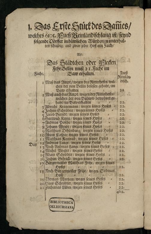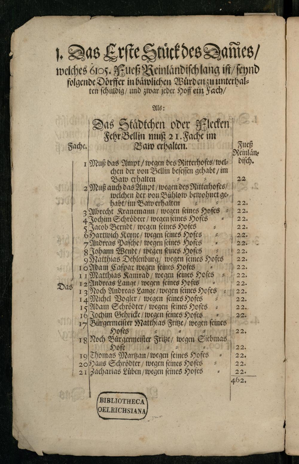 Das Städtchen oder Plecken Fehr Bellin muß 21. Fache im Bap erhalten. Muß das Ampt/ wegen des Ritterhofes/ wel⸗ chen der von Bellin beſeſſen gehabt/ im Baw erhalten Muß auch das Ampt/ wegen des Ritterhofes welchen der von Bühlow bewohnet gehabt/ im Baw erhalten Albrecht Kranemann/ wegen feines Hofes Jochim Schroͤdeer/ wegen ſeines Hofes Jacob Berndt/ wegen feines Hofes Hartwich Keyne/ wegen feines Hofes Andreas Paſche/ wegen feines Hofts Johann Wendt/ wegen ſeines Hofts Matthias Dehlenburg/ wegen feines Hofes Adam Caſpar wegen feines Hofes Matthias Kamrad/ wegen feines Hofes Andreas Lange/ wegen ſeines Hofes