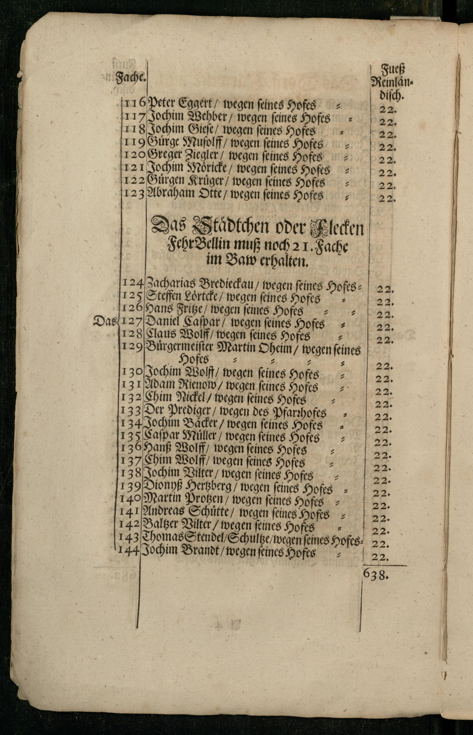 diſch. 116 Peter Eggert/ wegen feines Hofes 22. 117 Jochim Wehber/ wegen ſeines Hofes 22. 18 Jochim Gieſe/ wegen ſeines Hofes 22. 119 Guͤrge Muſolff/ wegen feines Hofes 22. 120 Greger Ziegler/ wegen feines Hofes 22. 121 Jochim Keoͤricke/ wegen feines Hofes 22. 122 Guͤrgen Krüger/ wegen feines Hofes 22 123 Abraham Otte/ wegen feines Hofes 22. Das Staͤdtchen oder lecken Fehr Bellin muß noch 2 1. Fache im Bap erhalten. 124 Zacharias Bredieckau/ wegen feines Hofes⸗ 22. 125 Steffen Loͤrtcke/ wegen feines Hofes 22. 126 Hans Fritze/ wegen feines Hofes ʒ⸗ 22. Das 127 Daniel Caſpar/ wegen feines Hofes 22.