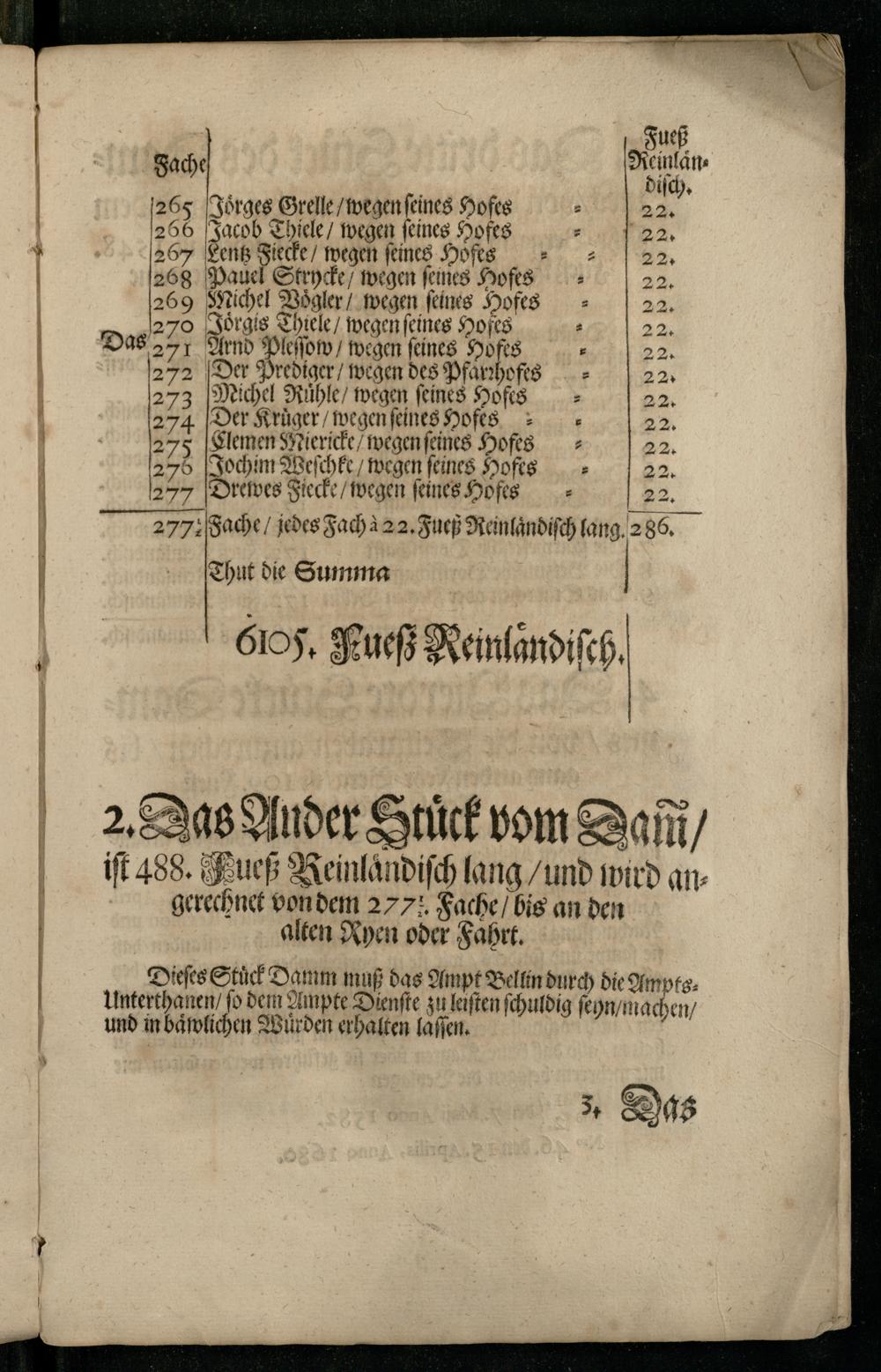 2. Das Ander Stück vom Damn/ iſt 488. Pueß Reinlaͤndiſch lang/ und wird an— gerechnet von dem 277. Fache/ bis an den alten Ryen oder Fahrt. Dieſes Stuͤck Damm muß das Ampt Bellin durch die Ampts