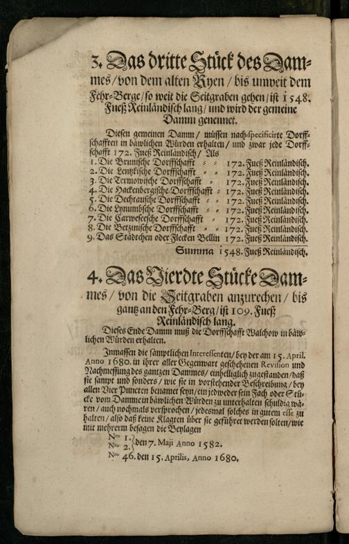 Inmaſſen die ſaͤmptlichen Intereſſenten/ bey der am 15. April. Anno 1680. in ihrer aller Gegenwart geſchehenen Revifion und Nachmeſſung des gantzen Dammes/ einhelliglich zugeſtanden/ daß fie ſampt und ſonders/ wie fie in vorſtehender Beſchreibung/ bey allen Vier Puncten benamet ſeyn/ ein jedweder fein Fach oder Stücke vom Dammein baͤwlichen Wurden zu unterhalten ſchuldig waͤren/ auch nochmals verſprochen/ jedesmal ſolches in gutem elle zu halten/ alſo daß keine Klagten über fie geführet werden ſolten/ wie mit mehrerm beſagen die Beylagen