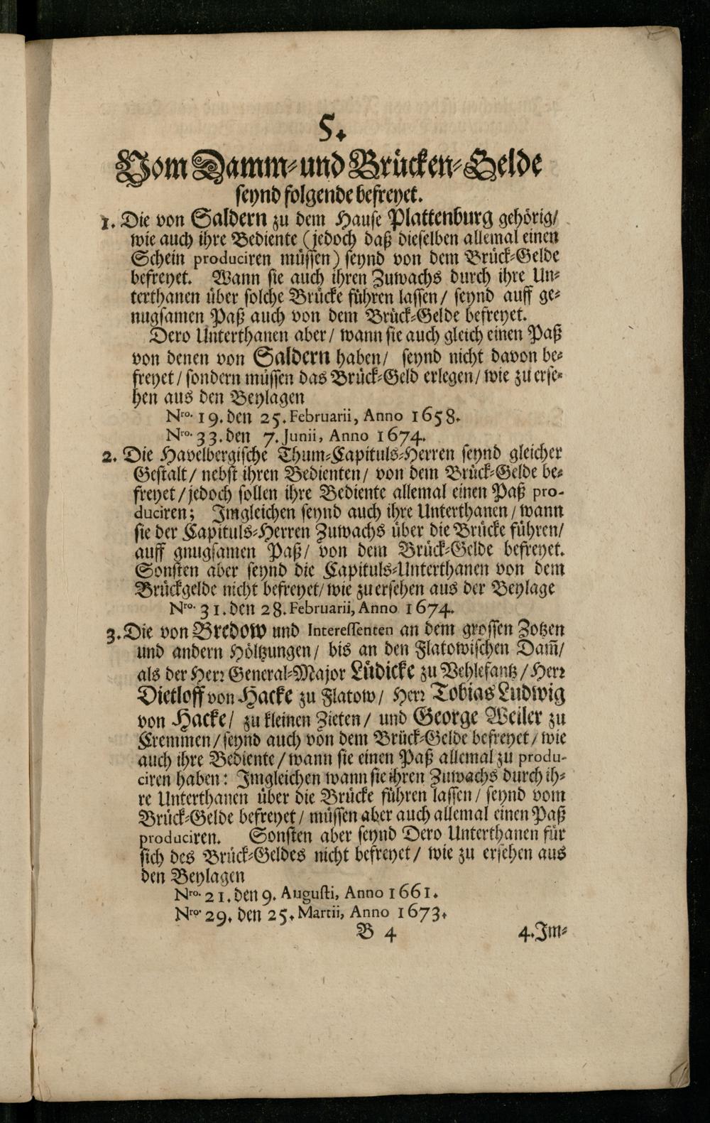 und andern Hoͤltzungen/ bis an den Flatowiſchen Dam/ als der Her: General Major Luͤdicke zu Vehlefanz/ Herz Dietloff von Hacke zu Flatow/ Her: Tobias Ludwig von Hacke/ zu kleinen Zieten/ und George Weiler zu Eremmen/ ſeynd auch von dem Brück Gelde befreyet/ wie auch ihre Bediente/ wann fie einen Paß allemal zu produciren haben: Imgleichen wann ſie hren Zuwachs durch ihre Unterthanen Uber die Brücke führen laſſen/ ſeynd vom Bruͤck⸗Gelde befreyet/ muͤſſen aber auch allemal einen Paß roduciren. Sonſten aber ſeynd Dero Unterthanen fuͤr ich des Bruͤck⸗Geldes nicht befreyet/ wie zu erſehen au den Beylagen Niro. 2 1, den 9. Auguſti, Anno I 661. Ni 29, den 25. Marti, Anno 1673. B 4