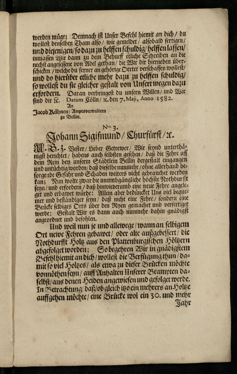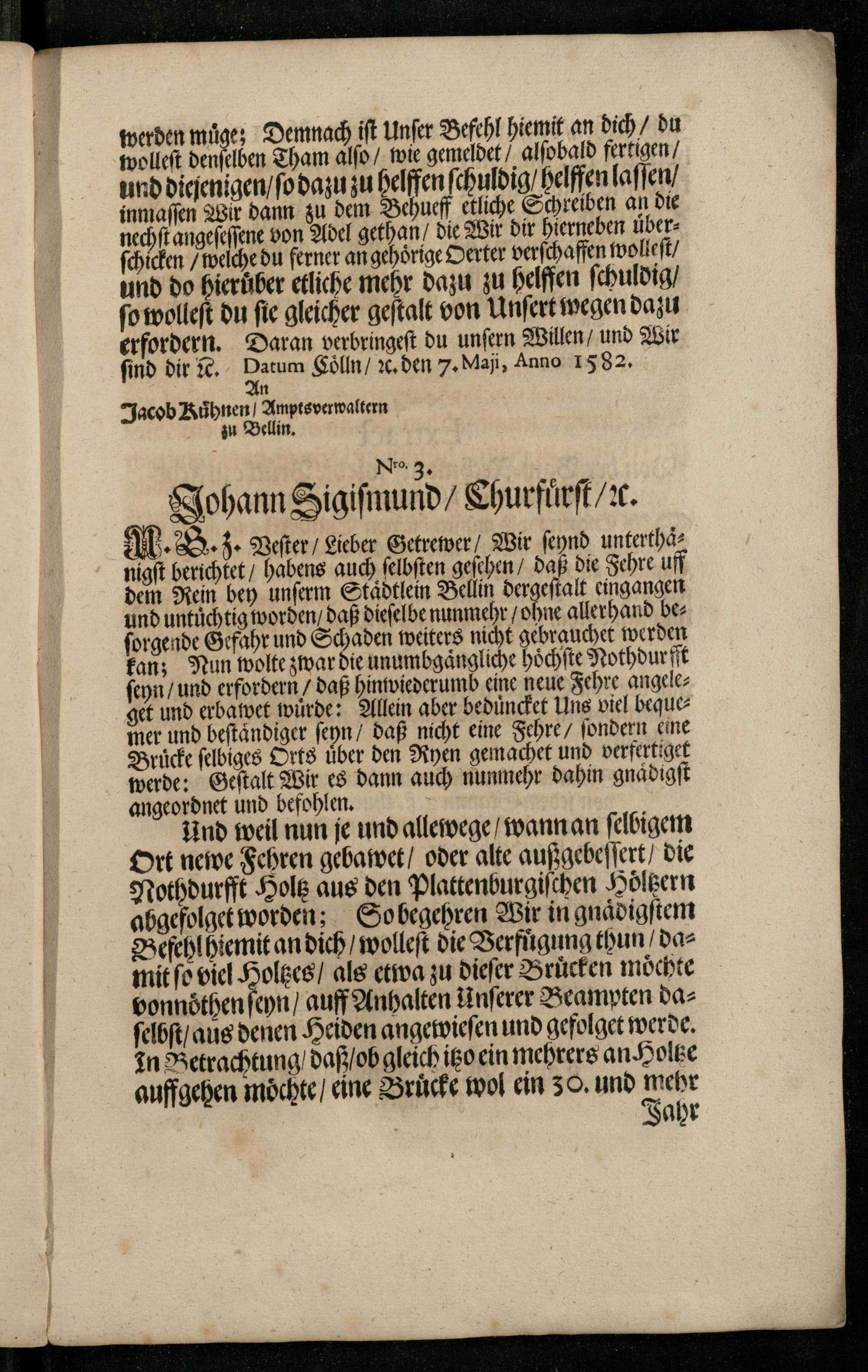 Johann Sigiſmund/ Churfuͤrſt/ e. M. S. z. Veſter/ Lieber Getrewer/ Wir ſeynd unterthaͤnigſt berichtet/ habens auch ſelbſten geſehen/ daß die Fehre uff dem Rein bey unſerm Staͤdtlein Bellin dergeſtalt eingangen und untüchtig worden/ daß dieſelbe nunmehr/ ohne allerhand beſorgende Gefahr und Schaden weiters nicht gebrauchet werden kan; Nun wolte zwar die unumbgaͤngliche hoͤchſte Nothdur ft ſeyn/ und erfordern/ daß hinwiederumb eine neue Fehre angeleget und erbawet wuͤrde: Allein aber beduͤncket Uns viel bequemer und beſtaͤndiger ſeyn/ daß nicht eine Fehre/ ſondern eine Bruͤcke ſelbiges Orts uͤber den Ryen gem achet und verfertiget werde: Geſtalt Wir es dann auch nunmehr dahin gnaͤdigſt angeordnet und befohlen.;