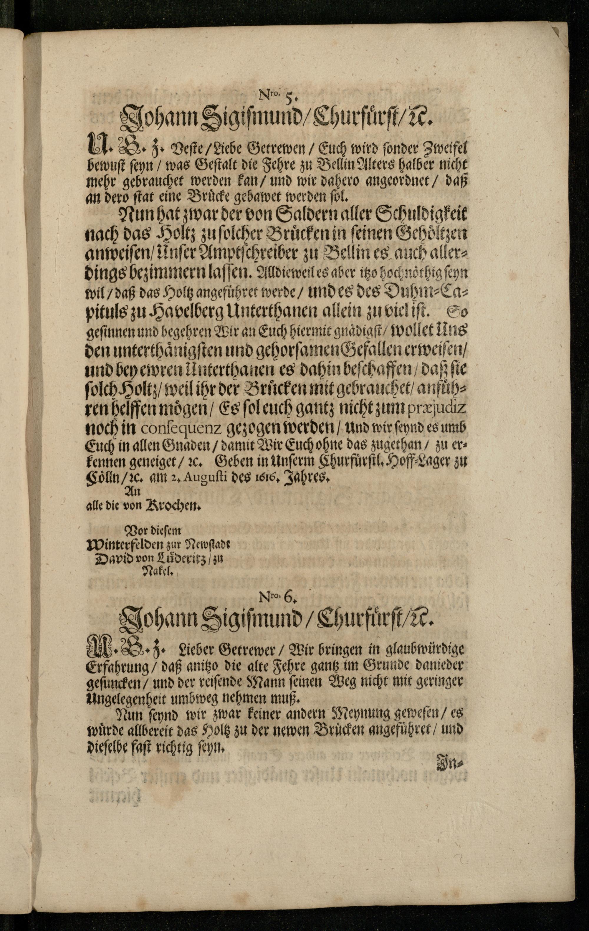 Nun hat zwar der von Saldern aller Schuldigkeit nach das Holtz zu ſolcher Bruͤcken in ſeinen Gehoͤltzen anweiſen/ unſer Amptſchreiber zu Bellin es auch allerdings bezimmern laſſen. Alldieweil es aber itzo hoch noͤthig ſeyn wil/ daß das Holtz angefuhret werde/ und es des Duhm⸗Capituls zu Havelberg Unterthanen allein zu viel iſt. So geſinnen und begehren Wir an Euch hiermit gnaͤdigſt/ wollet Uns den unterthaͤnigſten und gehorſamen Gefallen erweiſen/ und bey ewren Unterthanen es dahin beſchaffen/ daß fie ſolch Holtz/ weil ihr der Bruͤcken mit gebrauchet/ anfuͤhren helffen mogen/ Es ſol euch gantz nicht zum præſuciz noch in conſequenꝛ gezogen werden/ und wir ſeynd es umb Euch in allen Gnaden/ damit Wir Euch ohne das zugethan/ zu erkennen geneiget/ ꝛc. Geben in Unſerm Churfuͤrſtl. Hoff Lager zu