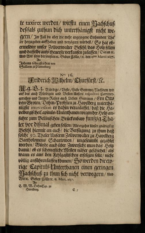 M g.. 3. Würdige/ Veſte/ Liebe Getrewe/ Nachdem wir auf des auch Wuͤrdigen und Veſten Unſers reſpective Cammergerichts⸗ und Ampts⸗Rahts auch Lieben Getreuen/ Ern Otto von Groten/ Dohm⸗Probſten zu Havelberg unterthaͤnigſte intercesſion es dahin veranlaſſet/ daß die Havelbergiſche Capituls⸗Unterthanen wegen der Holtz anfuhre zum Belliniſchen Bruͤckenbaw funfzig Thaler vor dißmal geben ſollen/ Als ergehet Unſer gnaͤdigſter Befehl hiermit an euch/ die Verfuͤgung zu thun daß ſolche 50. Thaler Unſerm Zollverwalter zu Havelberg Bartholomeus Schartowen/ ungeſcumbt gezahlet werden/ Würde auch uber Zuverſicht man das Holtz damit/ ob es ſchon etliche Meilen naͤher geſchiehet/ als wann es aus den Fehlgaſtiſchen erfolgen ſolte/ nicht vollig anführen laſſen koͤnnen/ So werden die ewrige Capituls⸗Unterthanen einen geringen Vachſchuß zu thun ſich nicht verwegern/ und